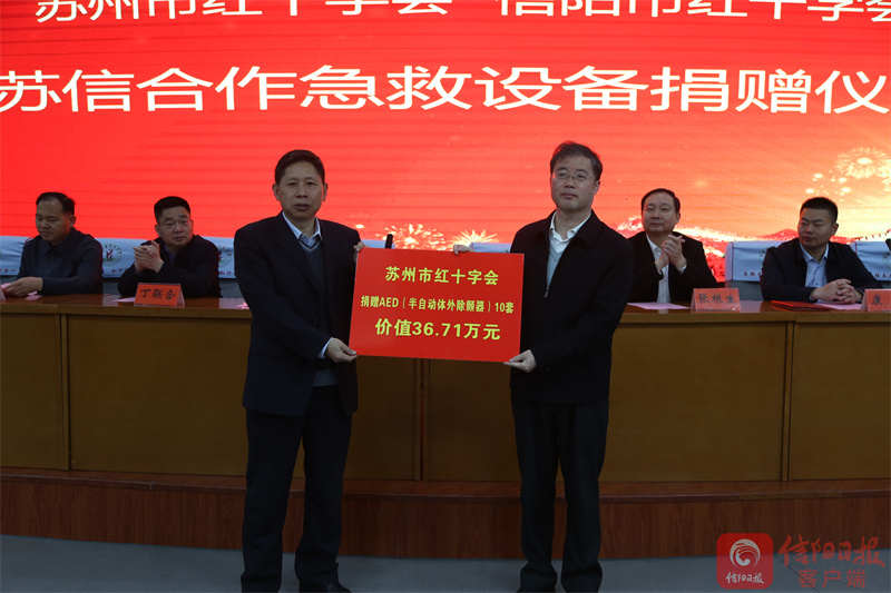 苏州市红十字会党组书记、常务副会长刘文伟表示,本次爱心捐赠设备价值近80万元,由信阳人在苏州创办的江苏华恒科技有限公司以及苏州本土的爱心企业家提供。这是苏信双方深化合作、共谋发展的生动体现。希望通过此次来访,与信阳人民建立更加紧密的合作机制,携手共进,共同书写人道领域合作发展的新篇章。