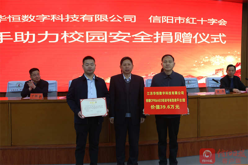 3月26日,由信阳市红十字会和苏州市红十字会联合开展的“心急救、常训练、护校园”活动走进羊山中学。活动启动仪式上,苏州市红十字会携手江苏华恒数字科技有限公司向信阳市红十字会捐赠了10套AED(半自动体外除颤器),向羊山中学捐赠价值40万元的急救培训设备。