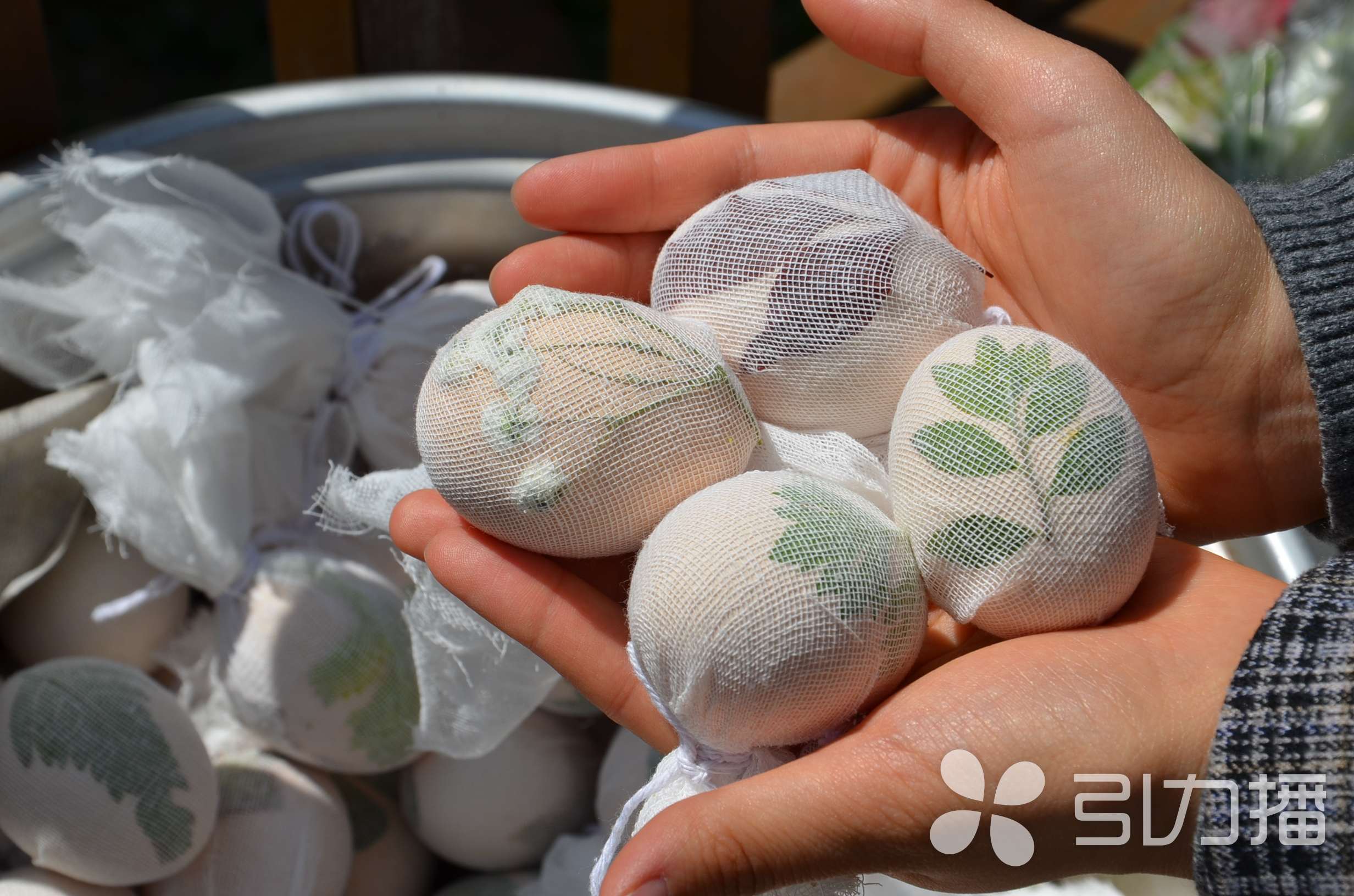据介绍,制作“植物蛋染”时要选取各式花木树叶,将其洗净后,用纱布和线绳固定在鸡蛋上,然后将鸡蛋和植物染料一同熬煮上色。在熬煮过程中,植物的形态会渐渐留在蛋壳上,形成好看的花纹。