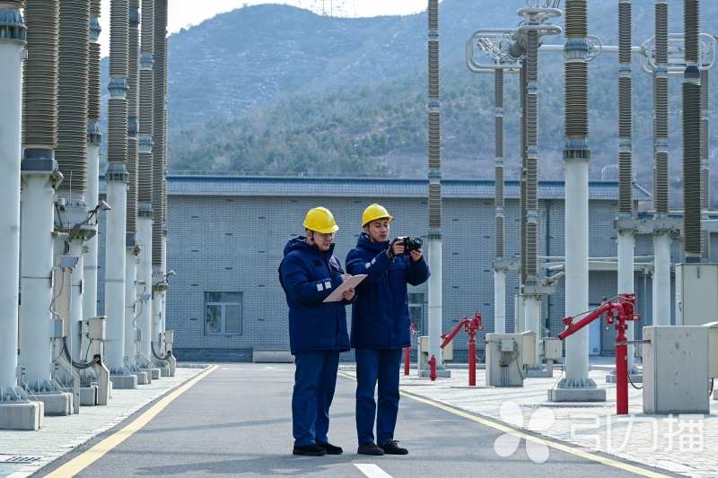 国网北京市电力公司检修分公司换流站值班员马志强(右一)与同事对电力设备进行红外测温工作。