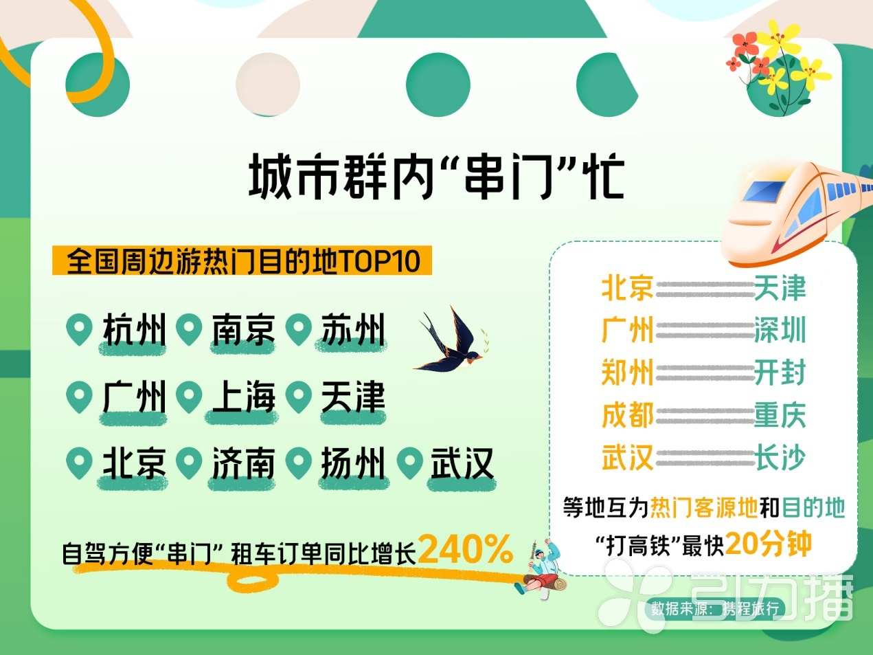 高铁动车、自驾等是清明假期出行的主要交通方式。同程用车清明假期预订量同比增长超六成,广州、苏州、杭州、东莞、深圳为最热门的用车目的地城市。携程国内租车订单同比增长240%,86%为跨城出行。
