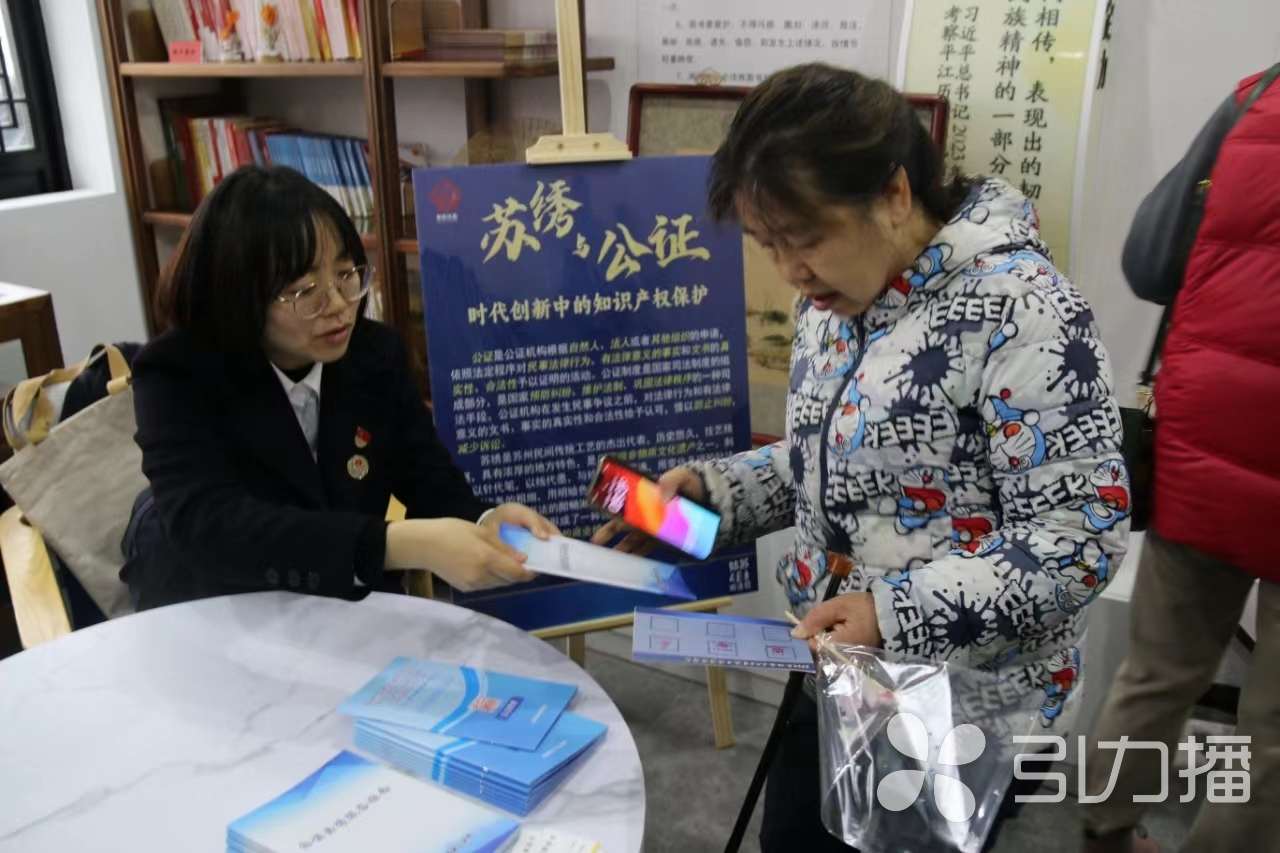 活动现场,人头攒动、气氛火热。在苏绣展位,一幅幅刺绣作品精美绝伦,吸引众多市民驻足观赏。同时,绣娘潘乃舒还在现场展示精湛的苏绣工艺。另外,来自苏城公证处的公证员陈康通过苏绣作品知识产权保护案例,宣传知识产权法律常识,推介取证存证工具软件——苏城存证APP。“姑苏古城非物质文化遗产代表性项目众多,在缂丝、灯彩、苏绣、核雕、桃花坞木板年画等诸多非遗项目中,都存在作品图案、设计被他人仿制的问题。运用苏城存证APP,可以即时将智力成果以图片、音视频形式上传存储,随时存、随时证,让维权变得更加便利。”他说。