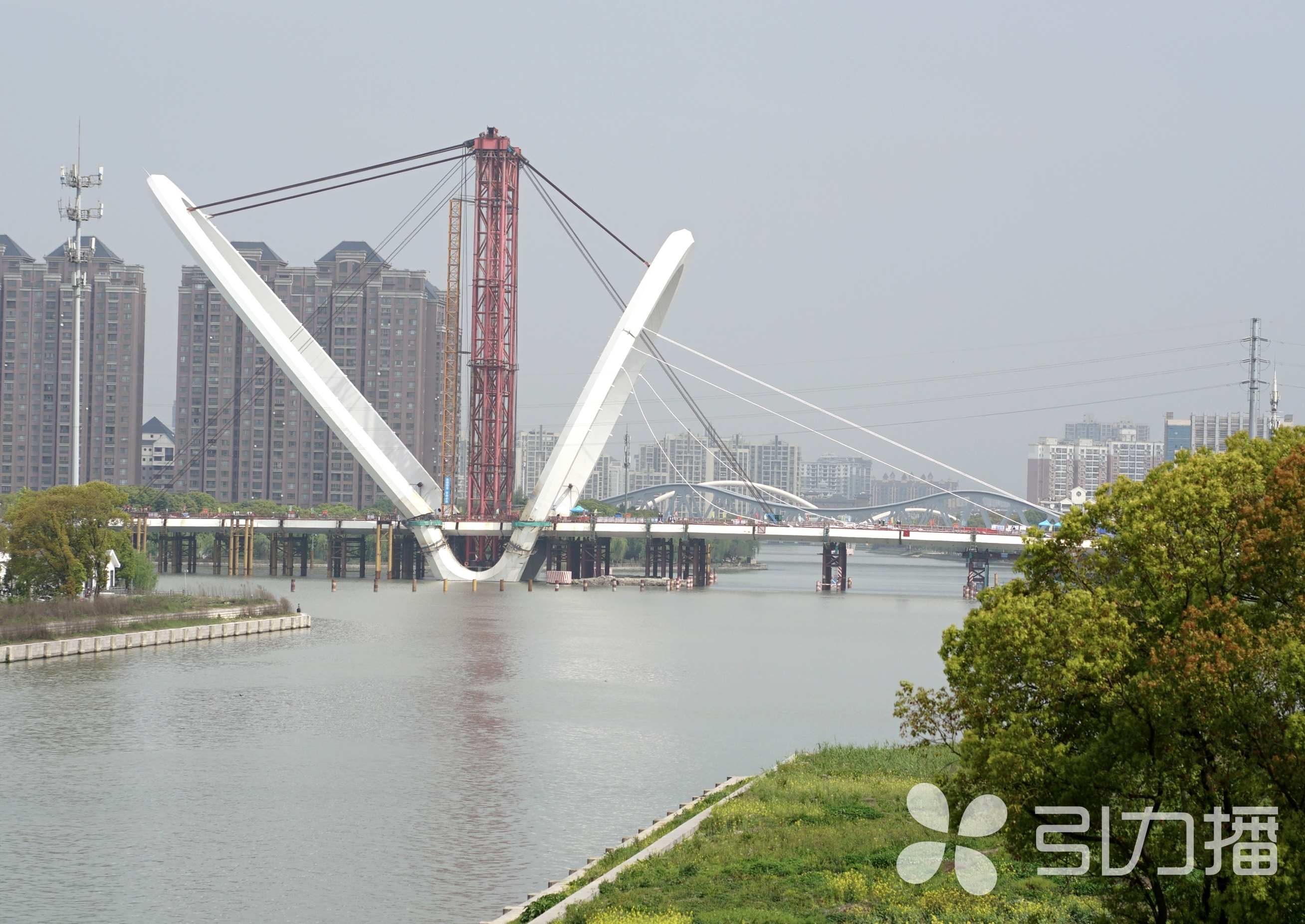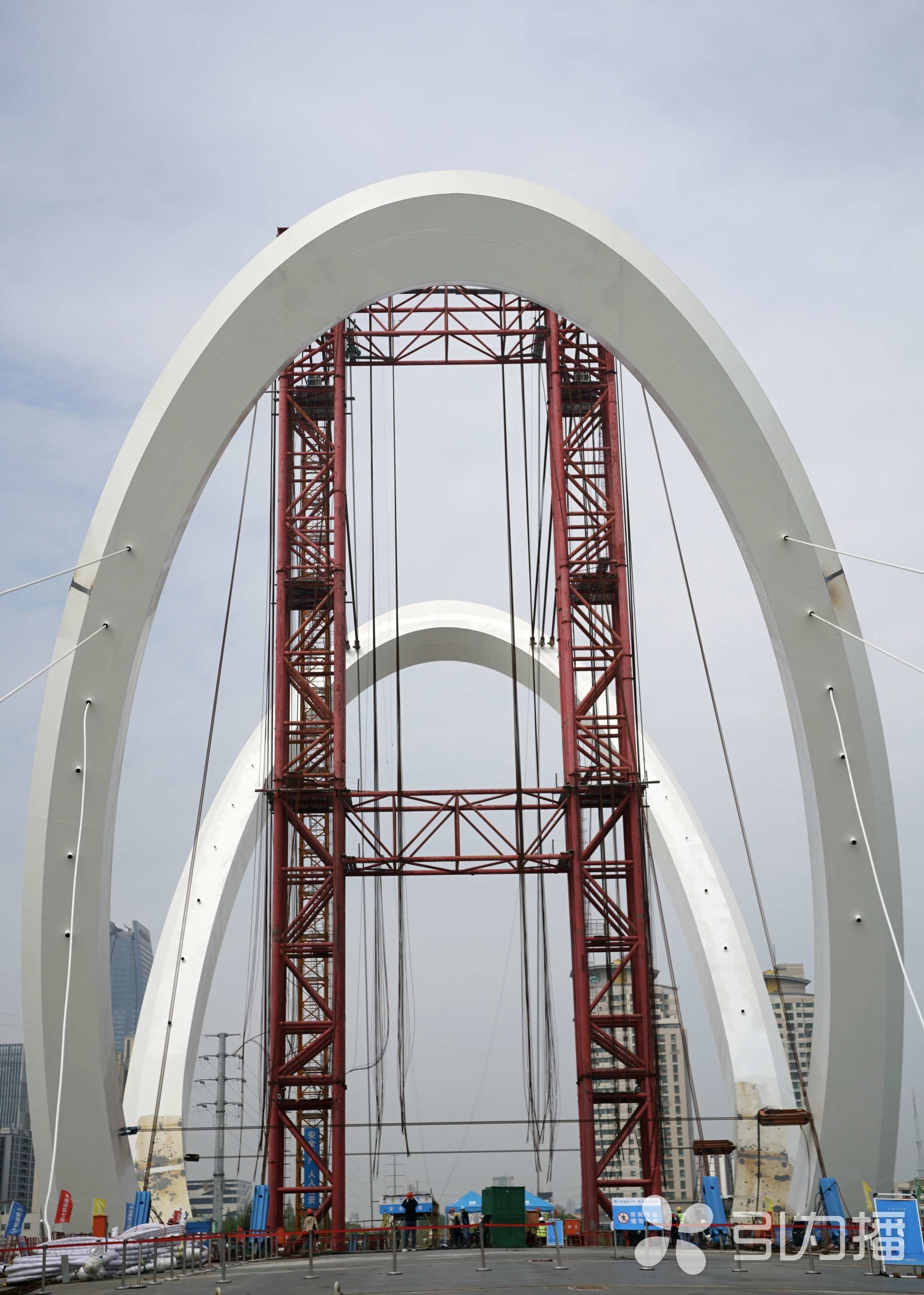 记者看到,在震川桥两朵“莲花”中矗立着一座高大的红色塔架,窦爱兵介绍,这是用来提升钢拱塔的临时结构,在钢拱塔转体过程中起到关键的安全保障作用,其水平位移误差全程控制在正负5厘米以内,一旦超过这个预警值就要停工纠偏。