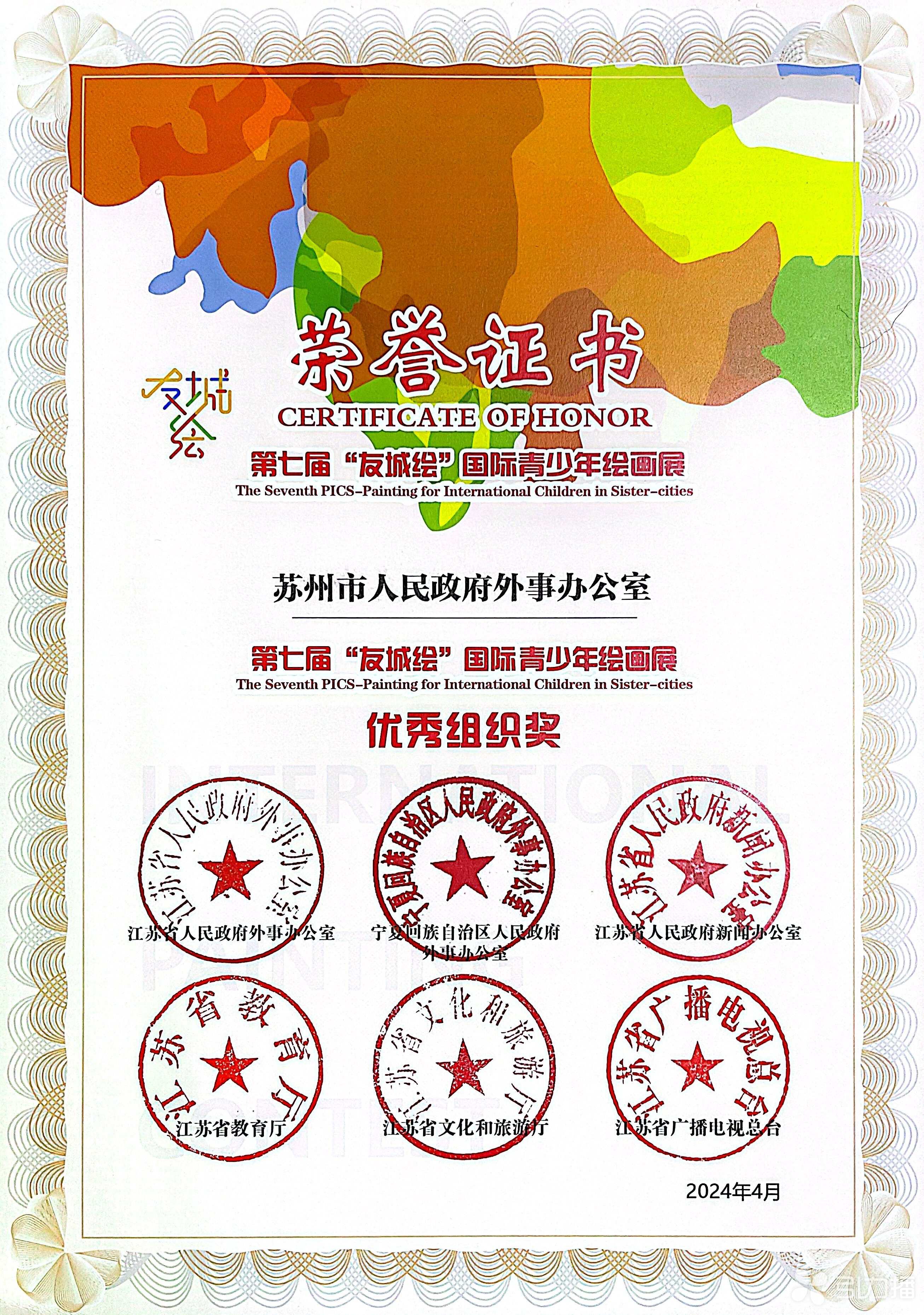 近日,苏州市外办在第七届“友城绘”国际青少年绘画展活动中荣获优秀组织奖,同时协调推荐国际友城罗马尼亚图尔恰省及友好交流城市乌拉圭弗雷本托斯市报送的8篇作品获奖。第七届“友城绘”国际青少年绘画展活动以“共绘世界梦”为主题,由江苏省外办、宁夏回族自治区外办及江苏省新闻办、省教育厅、省文旅厅、省广电总台共同举办,旨在进一步加强与世界各国友城间的文化交流与合作,增进青少年间相互了解与友谊。