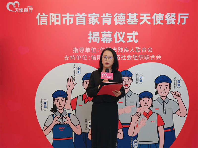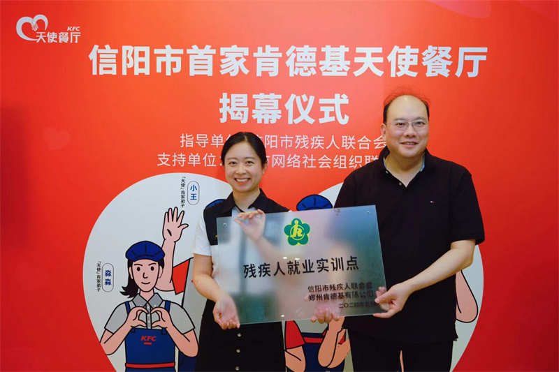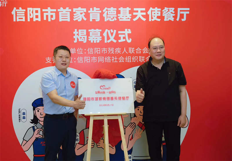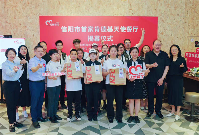 为打造最优营商环境,更好地服务企业、服务残疾人,5月17日上午,信阳市残联与肯德基餐厅共同举办肯德基“天使餐厅”揭牌仪式。这是信阳市残联继协助肯德基举行残疾人专场招聘会、残疾人面试之后的又一重要活动,为残疾人群体打造友爱共融、提升自我、实现职业发展助力。仪式现场,市残联党组成员、副理事长余翎致辞,信阳市残联党组书记彭乐与肯德基河南区域经理王雷共同为“天使餐厅”揭牌。