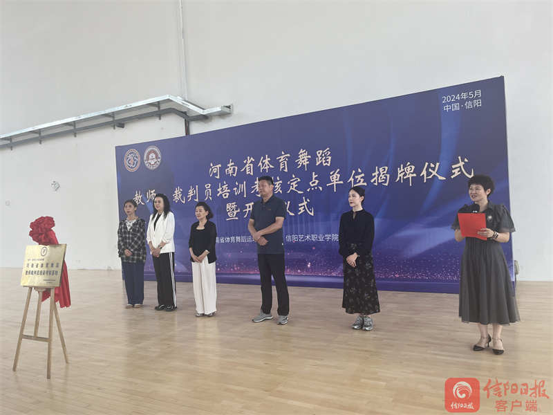 活动中,河南省体育舞蹈运动协会相关负责同志与信阳艺术职业学院相关负责同志共同为河南省体育舞蹈教师、裁判员培训考核基地揭牌。赵璐宣布此次培训班开班。