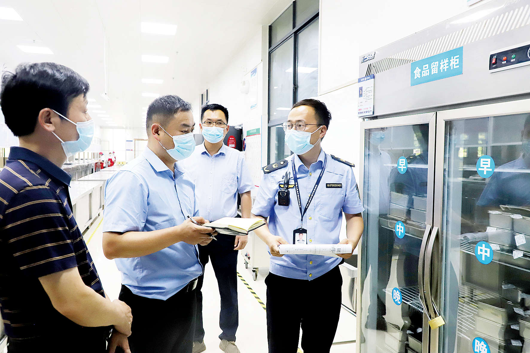 高考、中考即将来临。5月28日,市市场监管局羊山新区分局组织检查各学校食品安全,并督促坚守食品安全主体责任,从采购原料、食品加工、餐品留样等各个环节,形成安全闭环,确保广大师生“舌尖上的安全”,保持健康身体迎接考试。图为该局工作人员在大别山高中检查的情景。