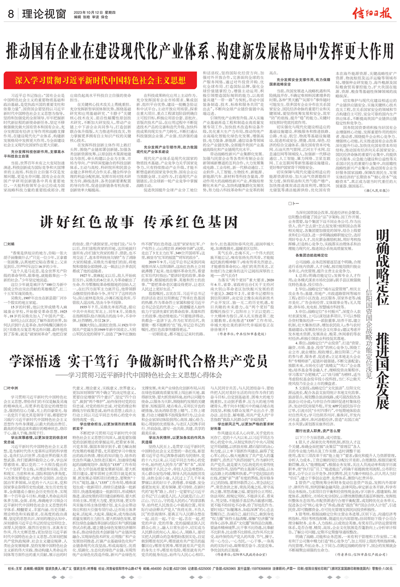 信阳日报坚持以习近平新时代中国特色社会主义思想为指导,深刻领悟“两个确立”的决定性意义,增强“四个意识”、坚定“四个自信”、做到“两个维护”,突出党媒主责主业,坚持政治家办报办网办新媒体,坚持围绕中心、服务大局,充分发挥信阳舆论战线主力军、主阵地、排头兵作用,认真履行“举旗帜、聚民心、育新人、兴文化、展形象”的使命任务,为塑造“美好生活 青春信阳”城市品牌、推动信阳经济社会高质量发展营造了良好舆论氛围。