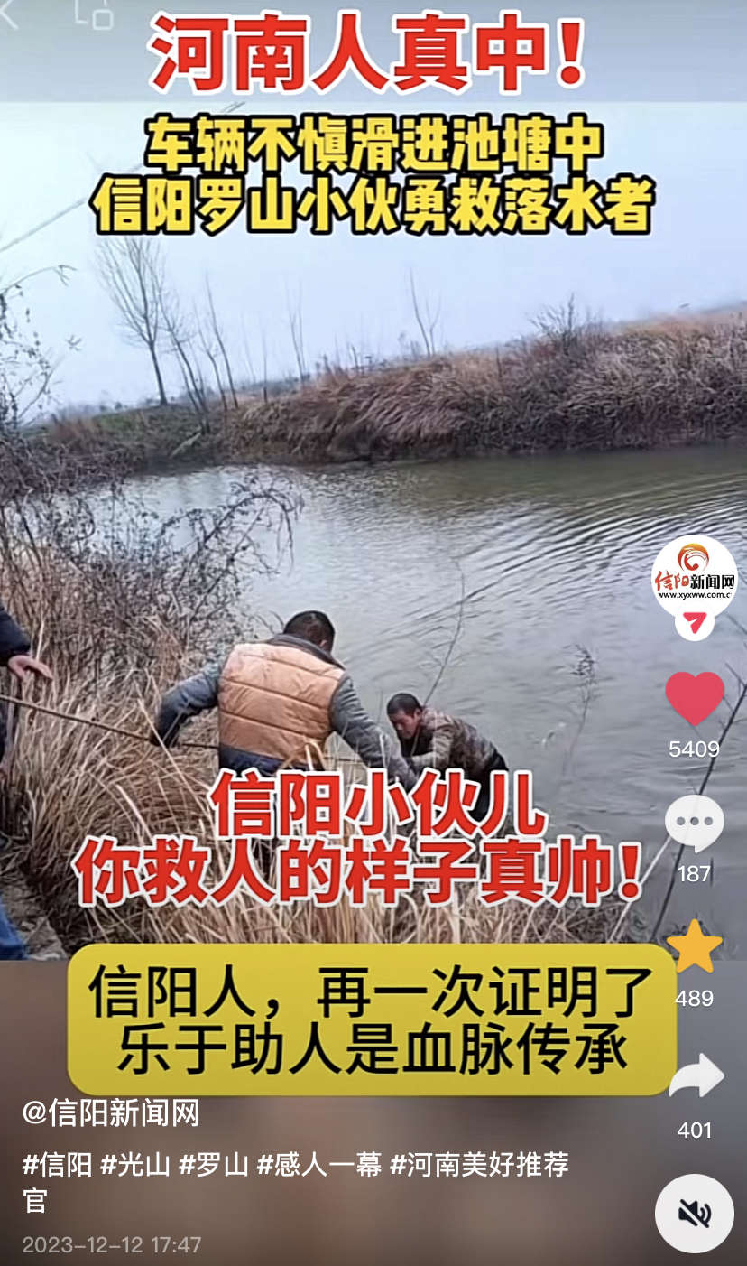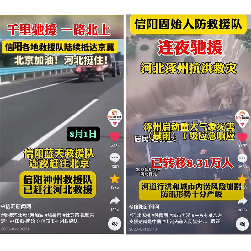 2023年8月,信阳新闻网抖音号报道抗洪救灾感人故事