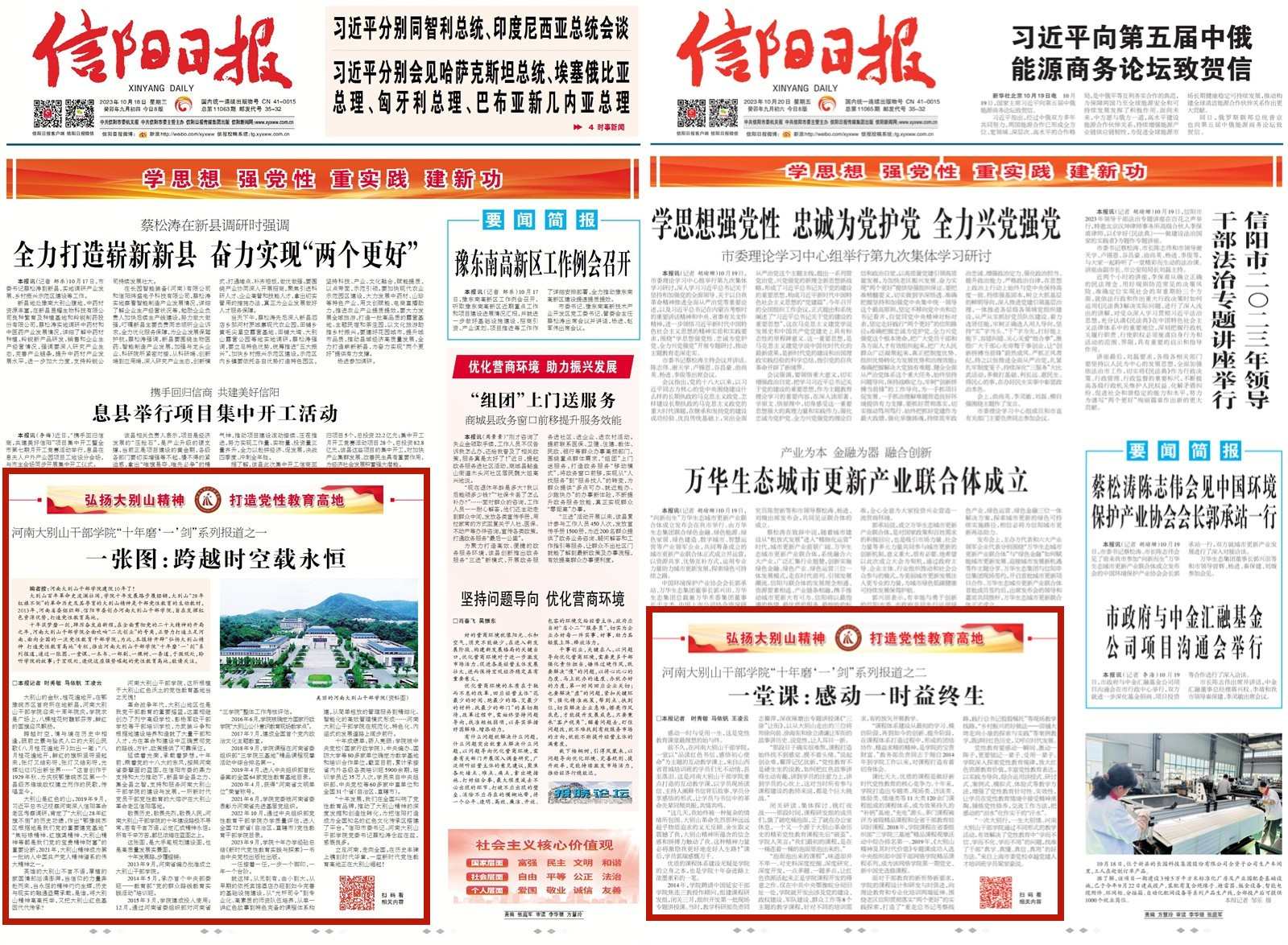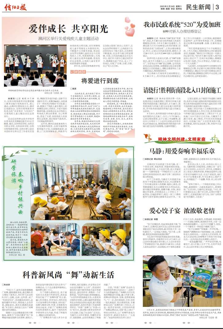 展示科教发展成就。策划推出有新意有深度的新闻产品,《创新之光点燃五月天》《让科学之光照亮梦想之路》等融媒报道聚焦科普教育,点燃科学梦想。信阳日报每周推出《教育风采》专版,开设《教育信息》《文明校园风采》《信阳市优秀班主任风采》等专栏,持续报道信阳科技创新亮点成果和教育事业发展变化。