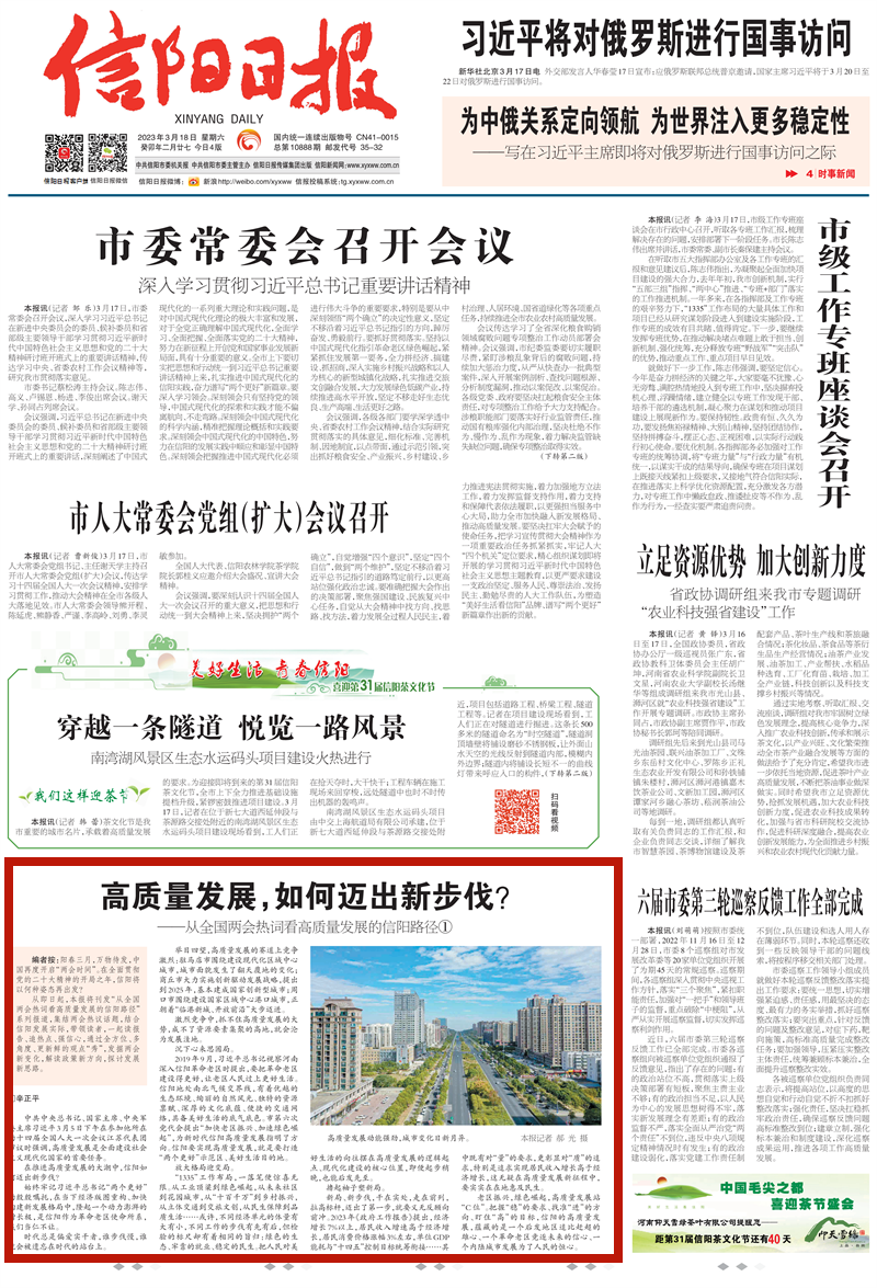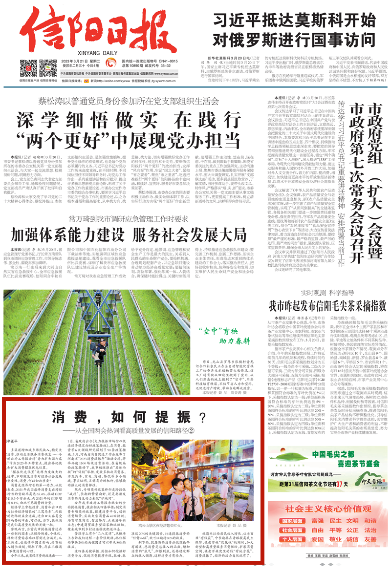 回应社会关切,有效引导舆论。信阳日报积极把握“时度效”原则,全年刊发重要评论文章100多篇,充分发挥了评论的压舱石、定盘星、风向标作用。聚焦重要节点、重大主题,推出《全力以赴开往振兴发展的春天》《向上,向上,乘势而上》《奏响新时代的淮河大合唱》等多篇重磅评论。其中,辛正平系列评论《从全国两会热词看高质量发展的信阳路径》,分别从《高质量发展,如何迈出新步伐》《消费,如何提振》《民营经济,如何健康发展》《乡村振兴,怎么扛旗》《绿色崛起,我们优势何在》等方面着手,聚焦全国两会热点,结合信阳发展实际,剖析新发展格局下革命老区信阳的使命担当。