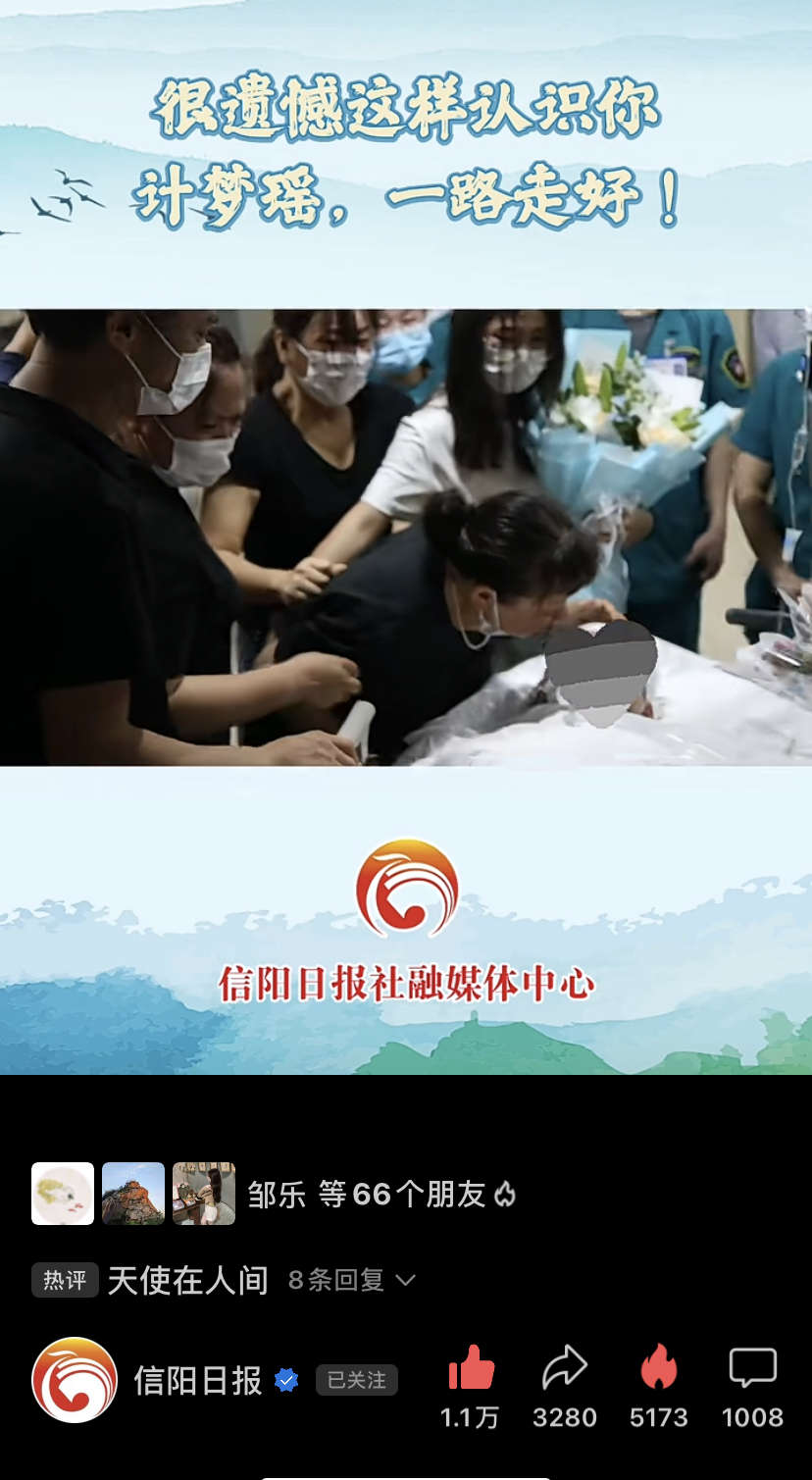 讲好信阳故事,传播信阳声音。2023年,积极向人民日报、新华社、经济日报、农民日报等中央级媒体提供稿件和视频30余篇(条),被“学习强国”全国学习平台选用转载稿件413篇,提升了信阳的知名度和美誉度。2023年8月,原创视频《很遗憾这样认识你 计梦瑶,一路走好!》报道信阳26岁女护士计梦瑶意外遭遇车祸捐献器官的感人事迹,引发全网关注,人民日报、新华社、中央广播电视总台等央媒纷纷转载,微博全网阅读量突破1亿次。