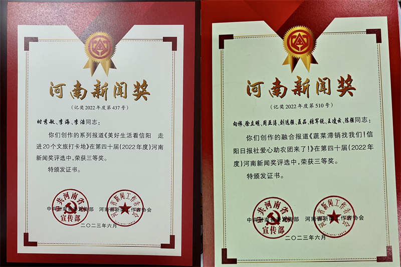 在第40届河南新闻奖评选中,信阳日报共有7篇(件)作品获奖,获奖作品涉及消息、评论、系列报道、融合报道、新闻业务研究等。2023年,信阳日报共有20余篇(件)作品获中国地市报新闻奖、赵超构新闻奖。