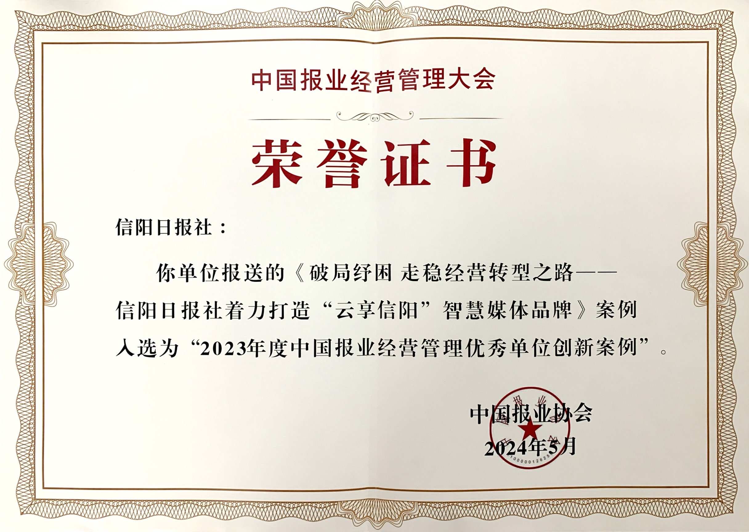 2023年11月,信阳日报社《公益助农项目及云享信阳助农平台》项目入选2023年度中国报业协会城市党报分会“媒体深度融合发展优秀创新案例”;信阳日报社党委书记、社长王军荣获2023年度城市党报媒体深度融合工作先进个人;信阳日报社新闻策划指挥调度中心荣获2023年度城市党报媒体深度融合工作先进集体。2024年5月,《破局纾困 走稳经营转型之路——信阳日报社着力打造“云享信阳”智慧媒体品牌》案例入选中国报业协会“2023年度中国报业经营管理优秀单位创新案例”。