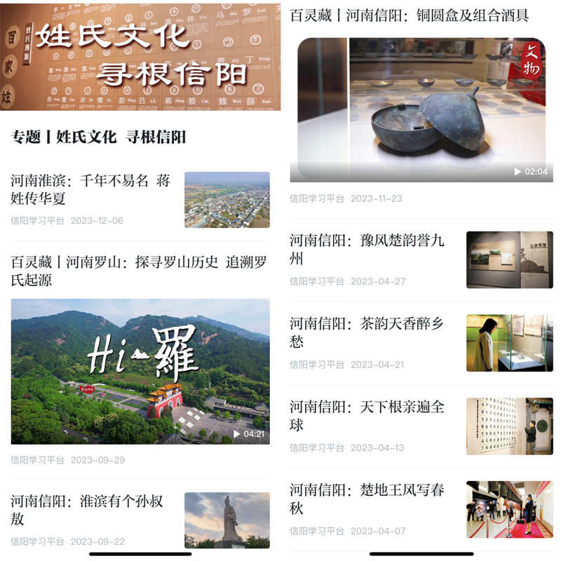 聚焦弘扬中华优秀传统文化,“学习强国”信阳学习平台开设《豫风楚韵》《姓氏文化 寻根信阳》《信阳文物之最》等专题,文艺副刊《百花园》推出根亲文化等专版专栏,展现中华优秀传统文化的深刻内涵,诠释老区信阳厚重的文化底蕴。