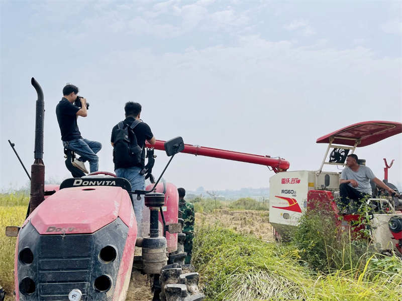 信阳日报记者周涛、刘远强(左起)采访“三夏”生产