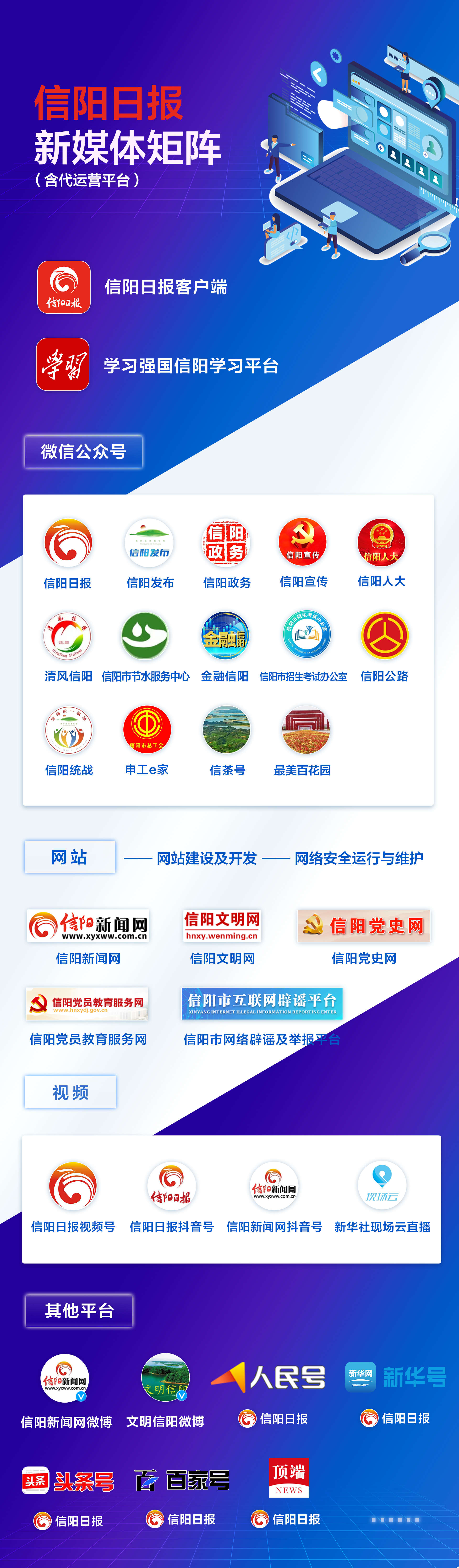 建强融媒体矩阵,提升新闻传播力。加强全媒体传播体系建设,整合“全平台+全链条+全方位”优势资源,打造“云享信阳”智慧媒体品牌,开辟了“流量+产业”的全新赛道,实现了“内容+运营”的破圈传播。搭建“新闻+政务服务商务”新型网络,托管运维“学习强国”信阳学习平台,承办运维信阳发布、信阳人大、信阳政务、清风信阳、信阳宣传等政务新媒体项目40多个,全媒体各平台综合粉丝量达1300多万。信阳新闻网抖音号粉丝突破47万,在河南省报业协会融媒榜传播影响力评比中获“抖音增幅排行第一名”。