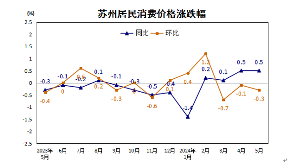 过去的5月份,苏州市民的菜篮子拎得相对轻松,猪肉、鸡蛋、蔬菜、水产品以及水果价格环比均有不同程度的下降。记者从国家统计局苏州调查队获悉, 5月份,苏州居民消费价格(CPI)同比上涨0.5%,涨幅与上月相同,环比下降0.3%。1-5月,苏州CPI与去年持平。