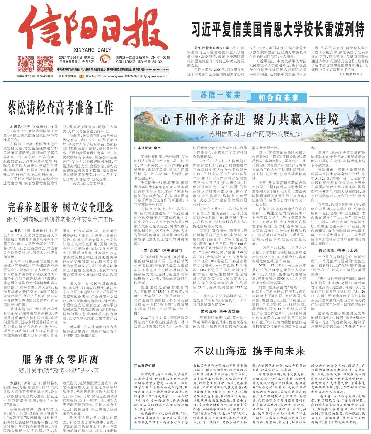 与此同时,子专栏“苏州人在信阳”系列稿件一并推出,专访河南晨怡智能织造科技有限公司董事长饶圣降、林青纺织公司创始人严建忠、中亿丰苏信合作建设发展有限公司董事长赵大峰等在信阳创新创业的苏州人,展现心手相牵的“双向奔赴”。特别是6月7日,苏信合作两周年当天,报纸头版推出新闻综述《心手相牵齐奋进 聚力共赢入佳境》和评论员文章《不以山海远 携手向未来》。
