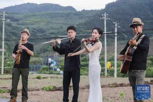 6月15日,三都镇镇头村的村民乐队乐手和杭州师范大学音乐学院的学生(右二、右三)在田间为村民即兴演出。
