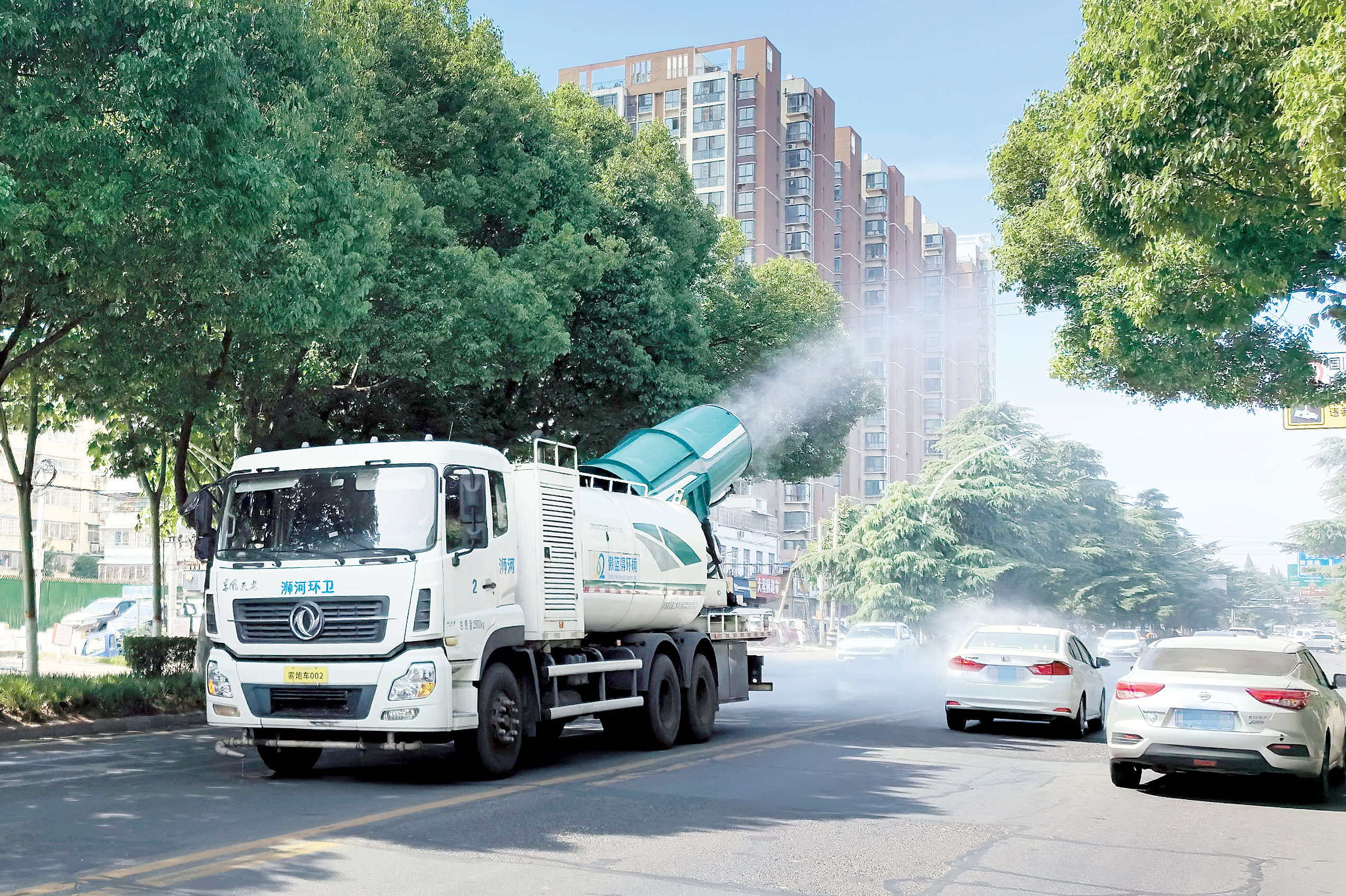 为应对连续高温晴热天气,连日来,浉河区环卫所出动数台洒水车积极开展洒水作业,给城市物理降温、降尘,为市民营造良好生活环境。