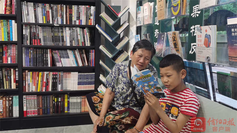 6月18日,浉河区五星街智慧谷书房里,老人在陪孩子读书