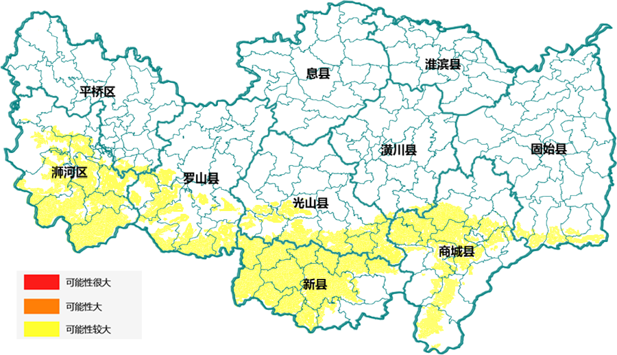 浉河区(谭家河乡、吴家店镇、东双河镇、浉河港镇、金牛山街道、十三里桥乡、董家河镇、柳林乡、南湾街道)、平桥区(高梁店乡、邢集镇、震雷山街道)、罗山县(朱堂乡、山店乡、铁铺镇、潘新镇、灵山镇、定远乡、周党镇、彭新镇)、光山县(马畈镇、凉亭乡、南向店乡、文殊乡、白雀园镇、殷棚乡、砖桥镇、泼陂河镇、晏河乡),新县辖区及各乡镇、商城县(苏仙石乡、汤泉池管理处、汪岗镇、余集镇、长竹园乡、观庙镇、赤城街道办、达权店镇、吴河乡、汪桥镇、冯店乡、伏山乡、双椿铺镇、李集乡)、固始县(段集镇、方集镇、祖师庙镇、陈淋子镇、武庙集镇)发生地质灾害的可能性较大。