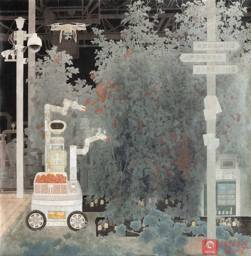 “现代科技给我们生活带来了太多便利。《科技兴农逐梦时》着重表现科技力量在农业领域给我们带来的惊喜与震撼。”侯泽涛告诉记者,“现代农业是未来农业的发展趋势。作为美术从业者,我们应大力发掘农业高科技题材作品,通过手中的画笔弘扬创新精神,推动农业高质量发展,赋能乡村振兴。”(信阳农林学院供图)