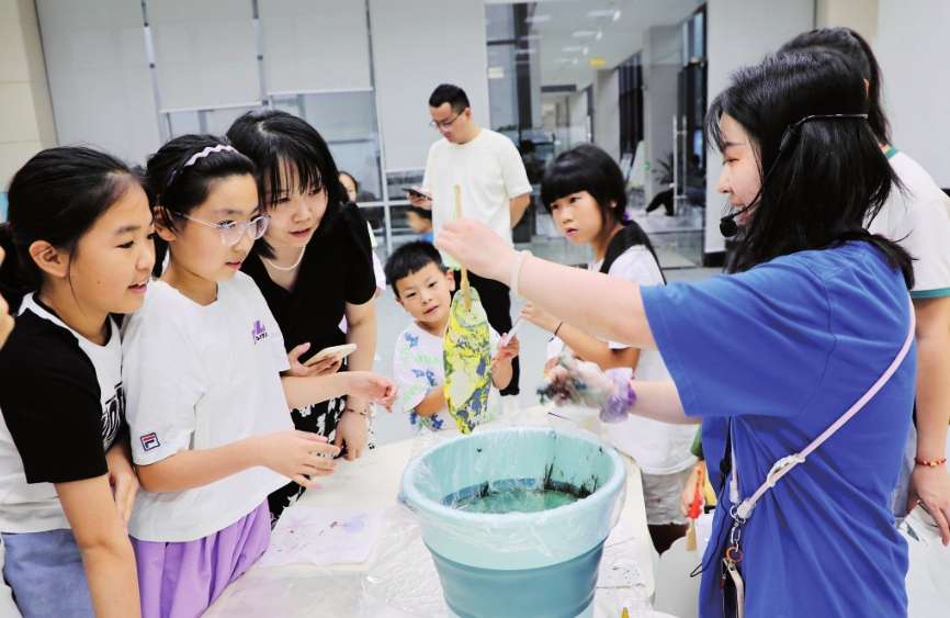 近日,信阳市图书馆少儿活动室内,孩子们在非遗课堂上学习大漆漂流扇的制作技艺。据悉,暑假期间,市图书馆将陆续推出多样化的文化和艺术课程,伴随读者特别是广大少年儿童悦享暑假、学有所得。信阳日报全媒体记者 李亚云 摄