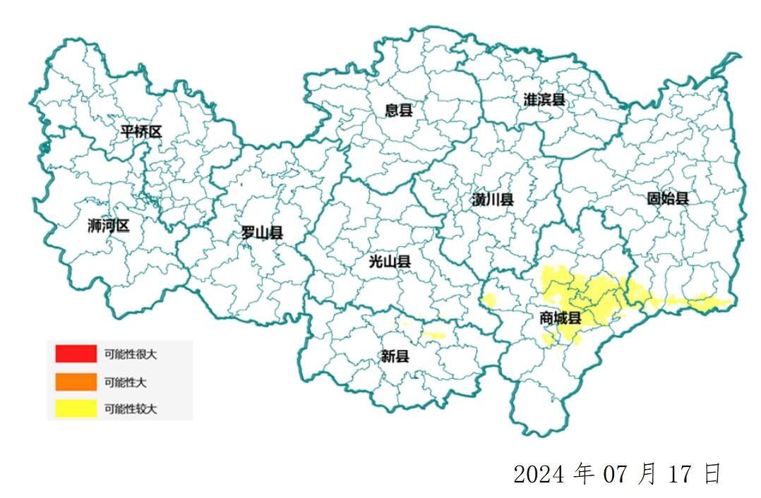 地质灾害黄色预警县区:光山县东南部局部;新县北部局部;商城县西部局部、东部大部;固始县南部局部,发生崩塌、滑坡地质灾害的可能性较大。