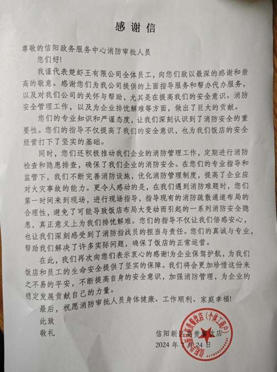 7月24日上午,信阳楚虾王有限公司给信阳政务服务中心消防审批人员送来一封感谢信,感谢审批人员提供的现场指导和帮办代办服务,对提高酒店的消防安全水平有很大帮助。