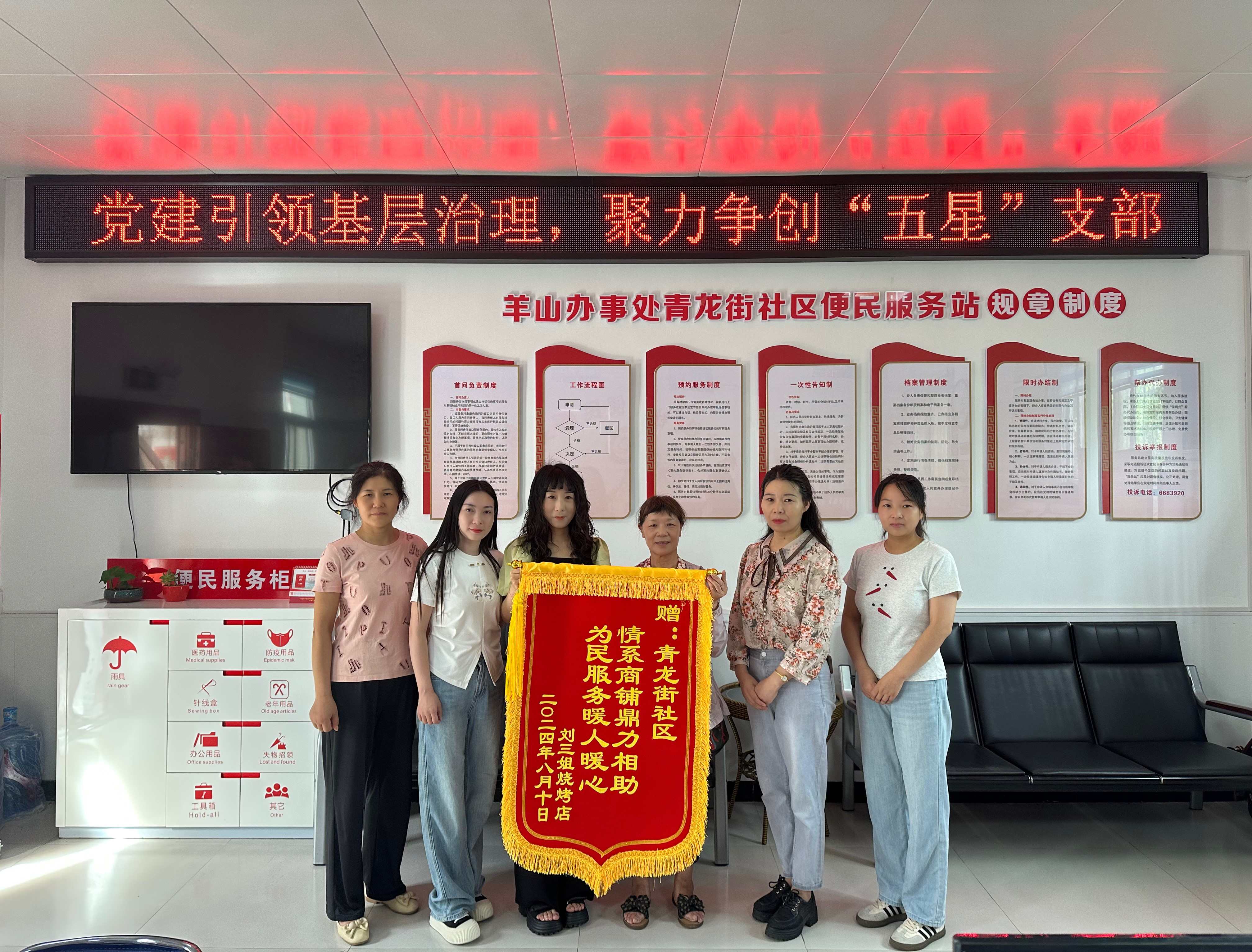 近日,羊山新区羊山街道办事处青龙街社区收到青龙街沿街商户送来的服务满意锦旗,向社区工作人员高效解决商户困难表示感谢。