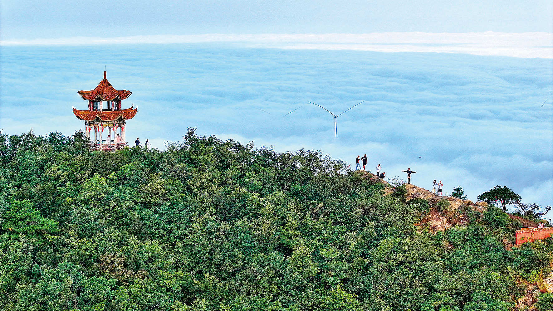 9月4日,位于浉河区李家寨镇的金鼎景区云海翻腾,山色云海交融成画。游客纷至沓来,争相打卡留念,尽赏自然之美。
