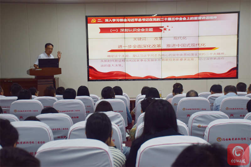 市社科联主席刘翔雁进行了党的二十届三中全会精神宣讲,播放了市委党校刘惠洁讲述的题为“一间屋、一座城:遇见美好生活”的宣讲视频,信阳广播电视台张燕敏作了题为“弯柳树村的蝶变”的宣讲,信阳博物馆刘雨娴以“大别山下的日记”为题作了宣讲。