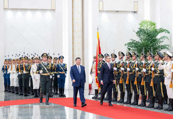 10月29日下午,国家主席习近平在北京人民大会堂同来华进行国事访问的芬兰总统斯图布举行会谈。这是会谈前,习近平在人民大会堂北大厅为斯图布举行欢迎仪式。新华社记者 殷博古 摄