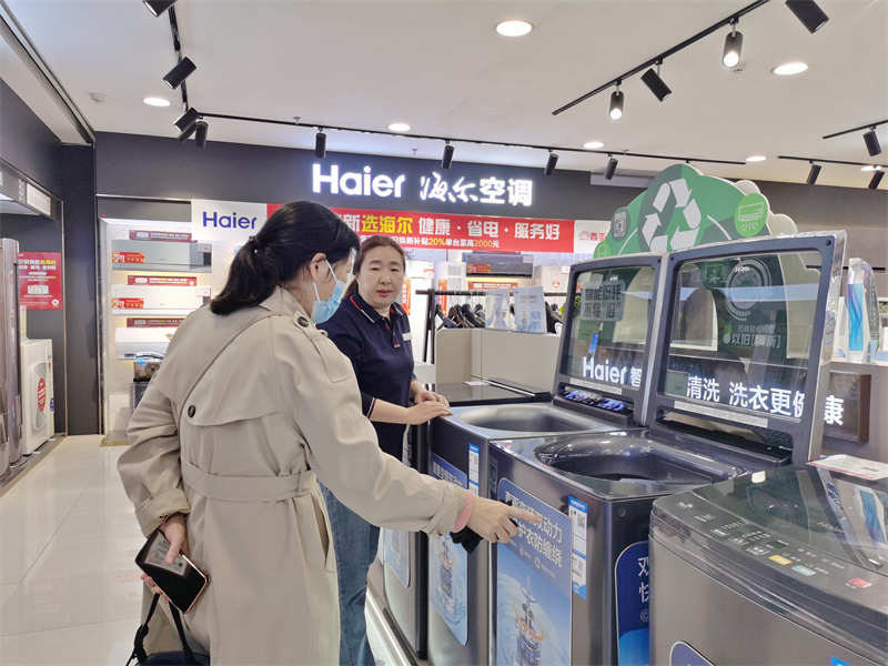 “补贴还在节能方面有要求,大家习惯认为20%的补贴指的是1级能效或水效标准产品。”刘经理说,“如果购买补贴范围内2级及以上能效或水效标准产品则按最终销售价格的15%给予补贴。就我们当前的销售情况看,多数消费者都选择了更高效节能的家电。”(图为11月12日,西亚电器和美广场店销售人员在向顾客介绍以旧换新家电)