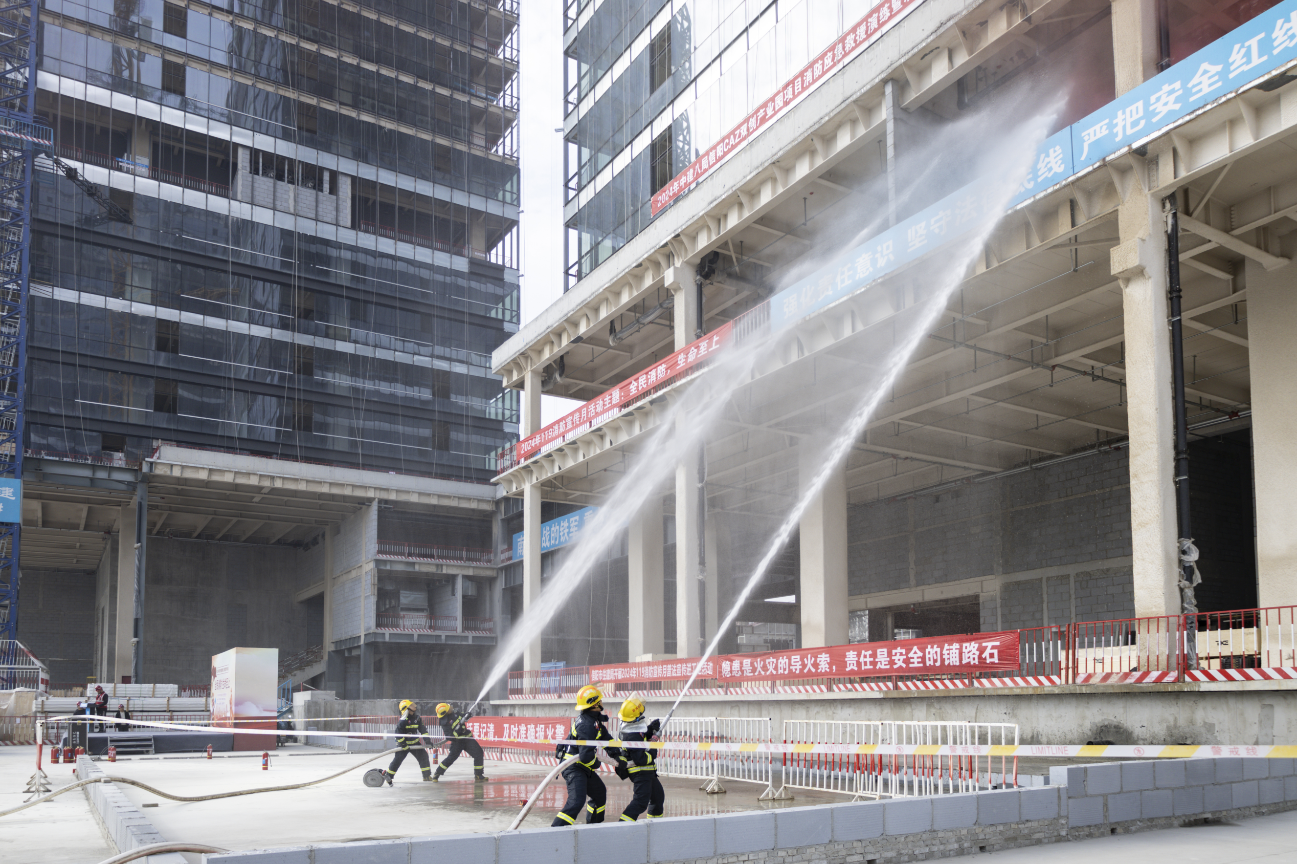 演练现场以施工领域重点部位动火作业引发火灾为场景,通过专(兼)职消防队初期处置、模拟报警和人员疏散、自动灭火设施的启动以及消防救援人员到场后开展的被困人员搜救、水枪阵地布置、登高平台车辆架设等操法,检验提升了建筑施工领域消防安全事故中救援人员的火灾初期处置和协同救援能力。
