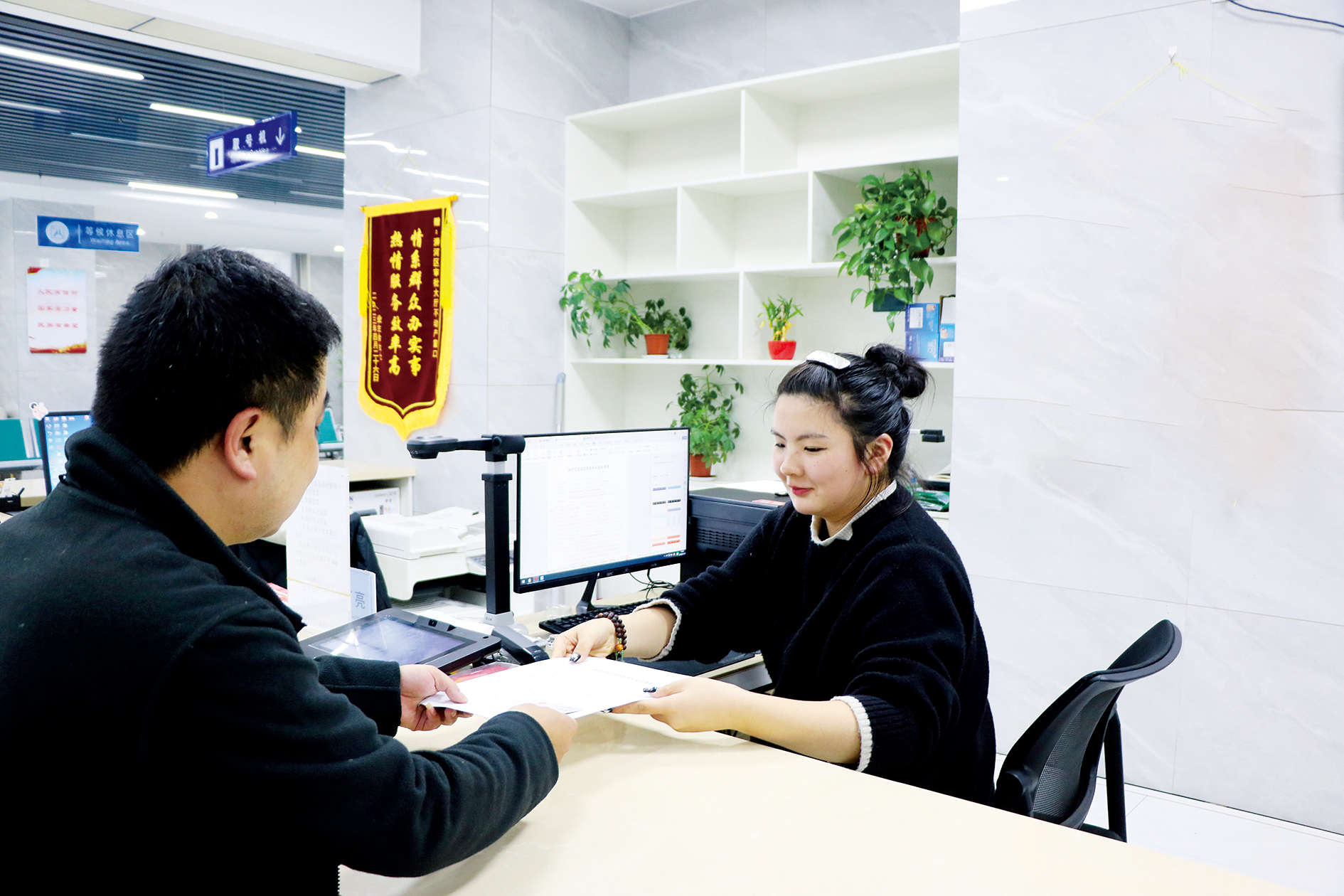 市民在浉河区政务服务大厅商品住房契税补贴窗口递交申请材料。