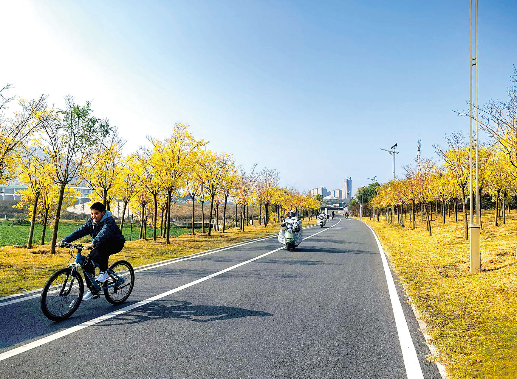 11月26日,市民在浉河三期湿地科普区内的柏油路上骑行。随着浉河三期治理工程基本完工,滨河绿带成为市民日常休闲、散步、健身的新晋打卡地。浉河三期治理工程以生态修复、功能修补的城市“双修”理念为导向,依托河道治理,因地制宜,生态优先,承接浉河水脉,打造“一脉、两带、六区、十二景”。
