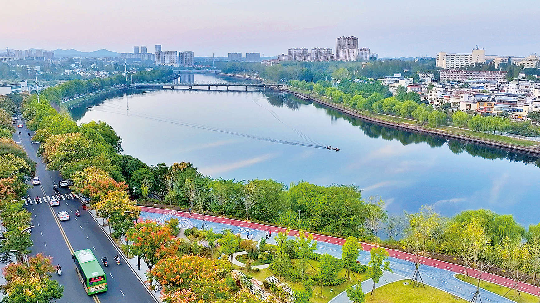 11月28日,为保护浉河水域生态环境,河道保洁员驾驶着垃圾打捞船,在河面上巡回清理落叶和漂浮垃圾,呵护一河清水。