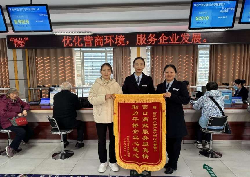 11月28日,业务经办人黄女士代表所在企业将“窗口高效服务显真情 助力平桥企业心连心”的锦旗赠送给信阳市不动产登记中心平桥窗口工作人员,为不动产窗口在临近下班之际,仍为企业开辟绿色通道延时服务,加班加点完成42套商铺的登记业务表示感谢。