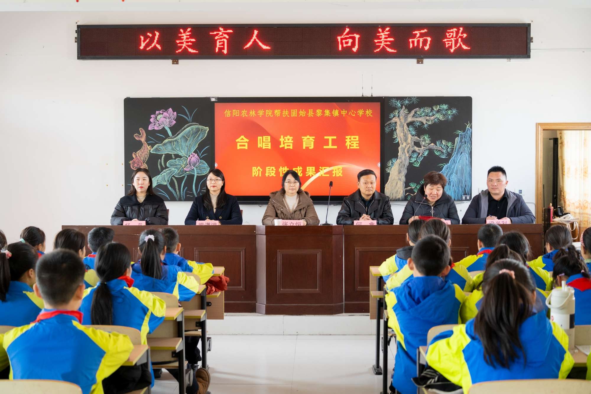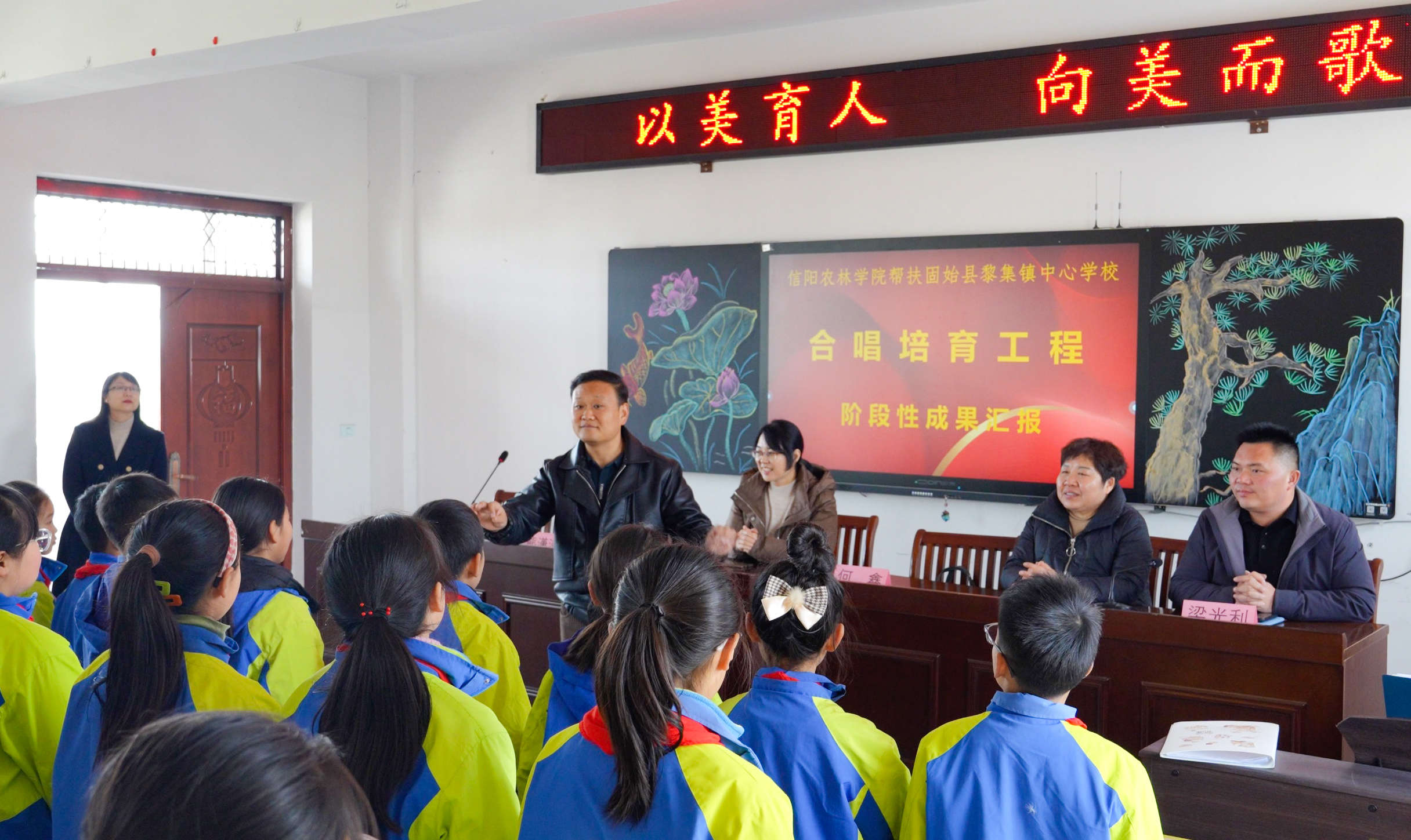据悉,此次信阳农林学院艺术教育中心负责同志带领团队成员前往固始县黎集镇中心学校,开展合唱培育工程阶段性成果汇报,旨在深入贯彻习近平总书记关于教育的重要论述精神,切实落实河南省教育厅组织实施的全省乡村中小学“以美育人,向美而歌”合唱培育工程。