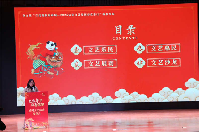 1月16日,记者从“传承优秀文化 守护美好记忆”暨“巳水年华·新春信阳”系列文化活动发布会上了解到,在2025年春节到来之际,信阳市文联以“百花迎新乐申城——2025信阳文艺界新春欢乐行”为主题,推出包含“文艺乐民”“文艺展赛”“文艺惠民”“文艺沙龙”四大板块的系列文化活动。