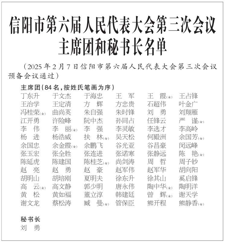 信阳市第六届人民代表大会第三次会议主席团和秘书长名单