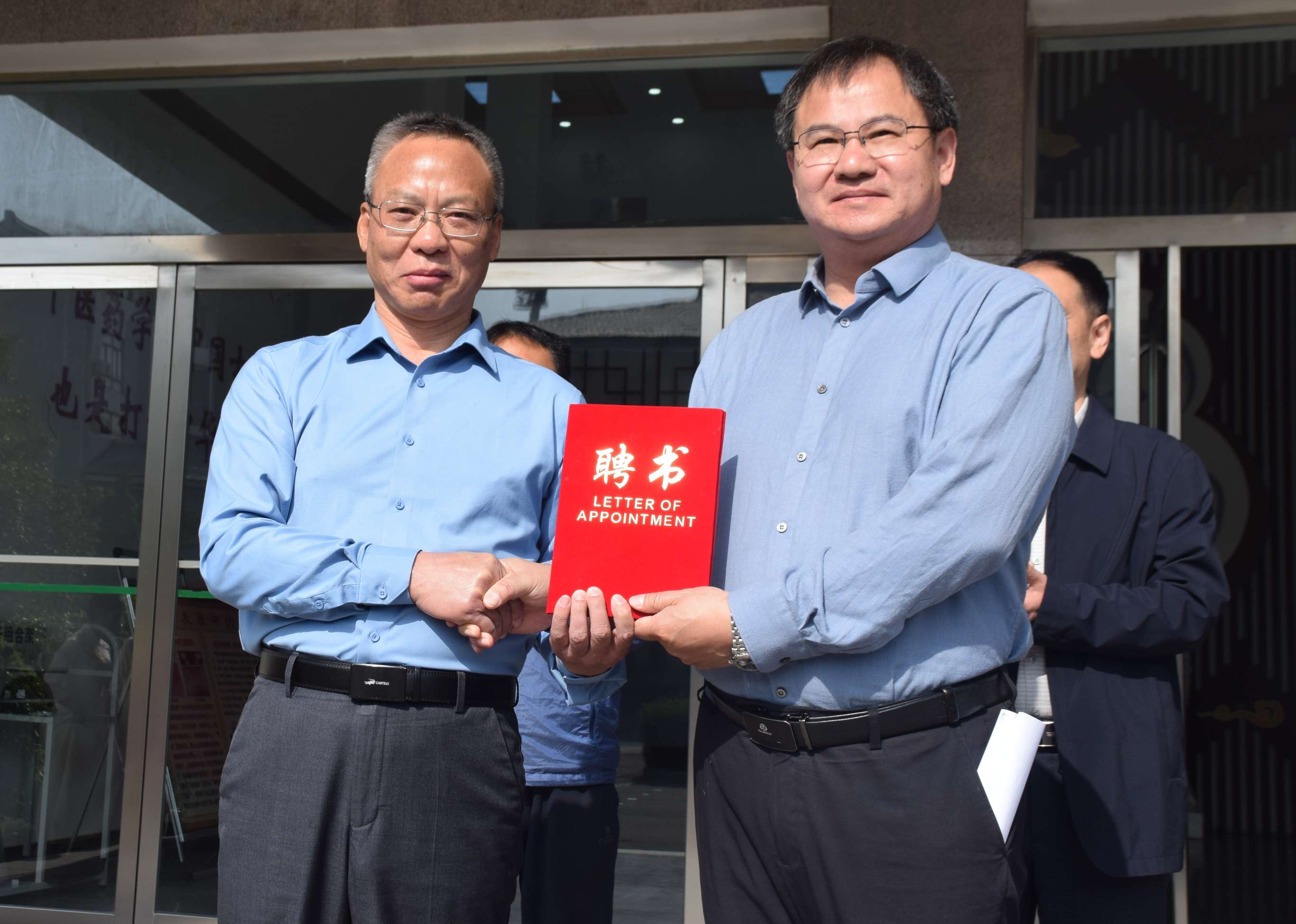 谢天学、汪明君、郑洪涛、许卫军共同为“大别山道地药材研究院”揭牌。郑洪涛为该校药学院教授许卫军颁发大别山道地药材研究院院长聘书。