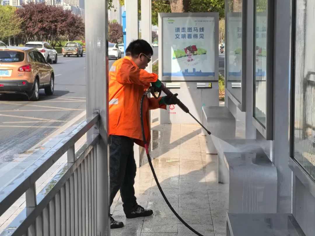 城市大清洗活动对垃圾收容器、公厕、中转站等环卫设备进行高压水枪与人工擦洗结合的深度清洗,及时修复更换破损设施,同步推进公交站亭、广告牌、隔离栏杆等沿街设施的全面消杀,确保外观洁净无污渍,城市“家具”洁净如新。日均冲洗公交站台及公共设施30余处,擦洗果皮箱、垃圾桶2000余个,清洗公厕120余座,垃圾中转站30余座。同时,为应对扬尘问题,依托雾炮车动态抑尘、绿化带高频次喷淋降尘,有效抑制重点路段扬尘,改善城区空气质量。