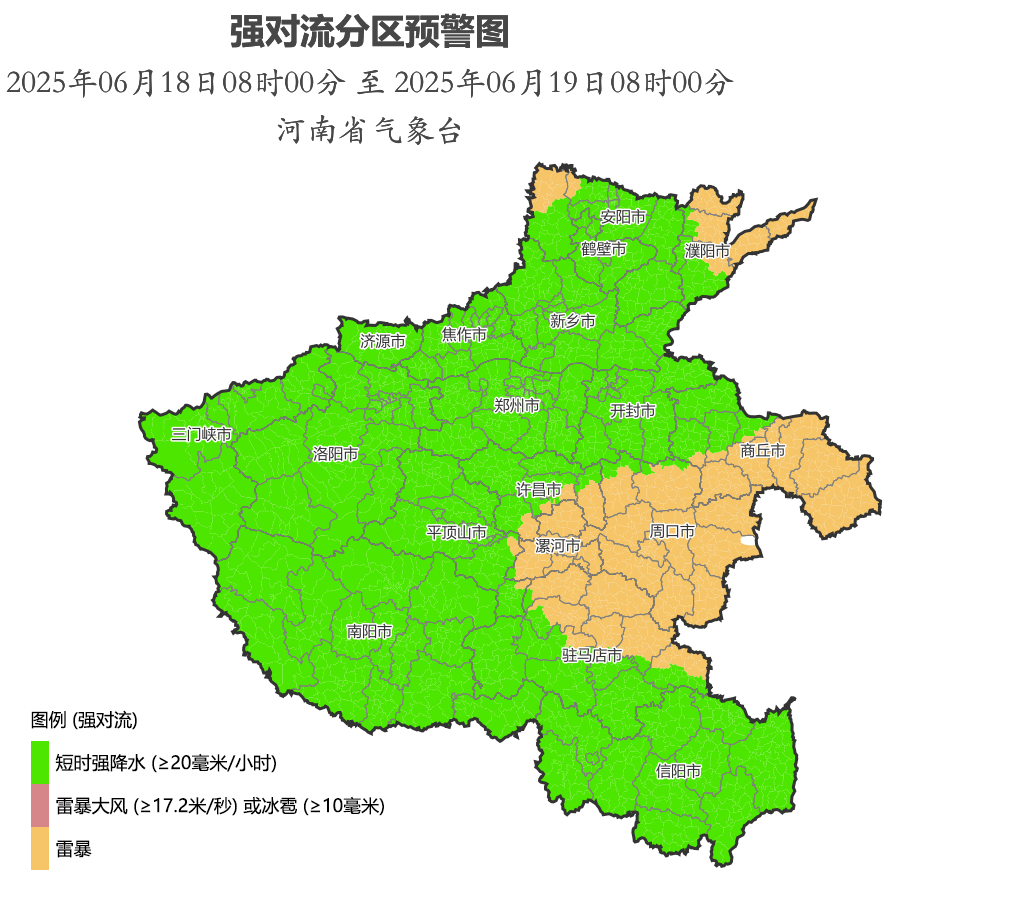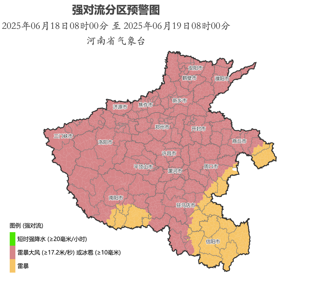 河南省气象台2025年6月18日8时发布强对流蓝色预警:预计6月18日8时至19日8时,全省大部将有8到9级雷暴大风和20到50毫米短时强降水,其中焦作、济源、三门峡、洛阳、郑州西部、平顶山西部、南阳西部局地将有10级以上雷暴大风和冰雹;济源、焦作、新乡、三门峡、洛阳、郑州、开封、许昌、平顶山西部、南阳西部局地将有50毫米以上短时强降水。请密切关注属地气象部门发布的最新预报信息和气象灾害预警信号,做好防范应对工作。