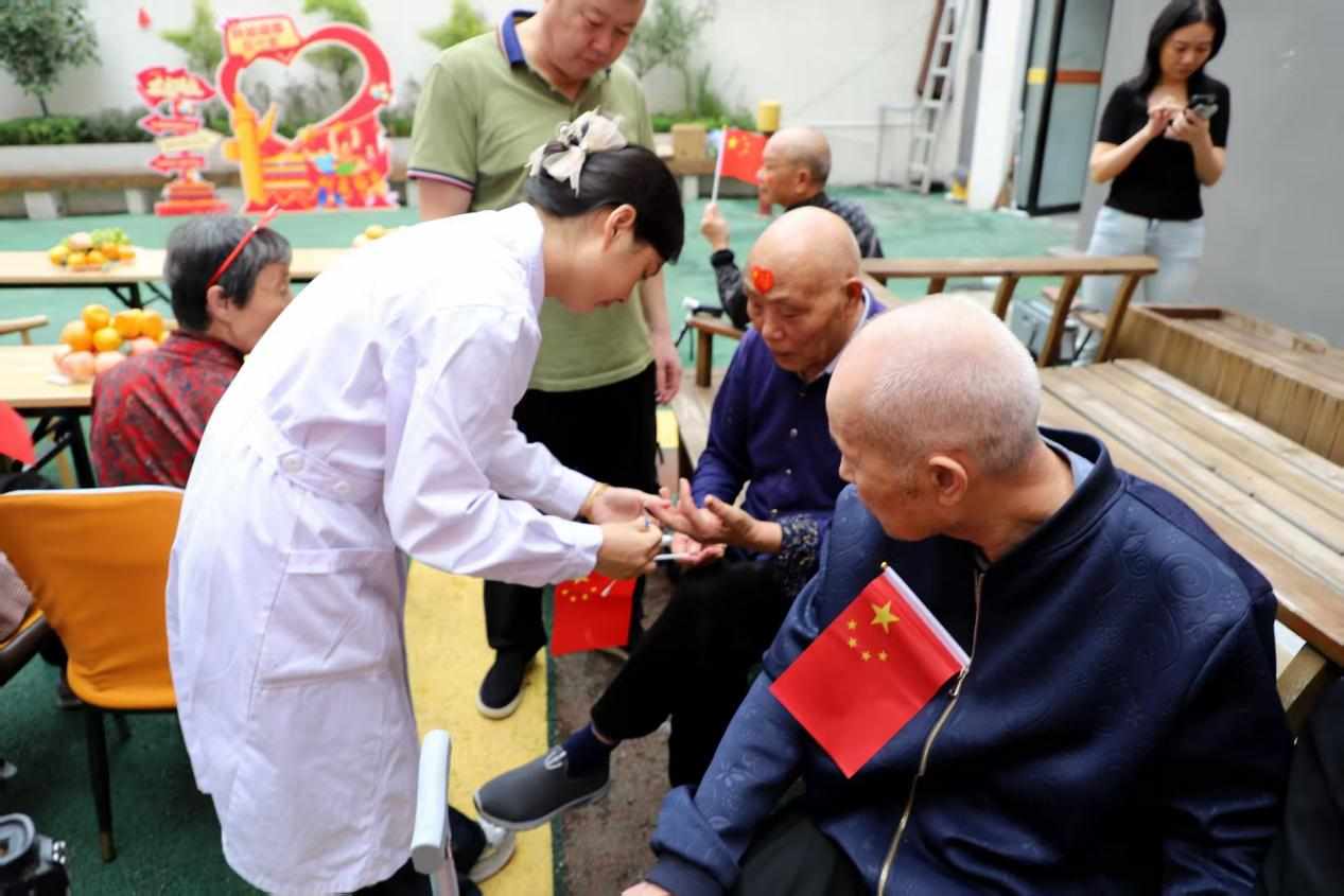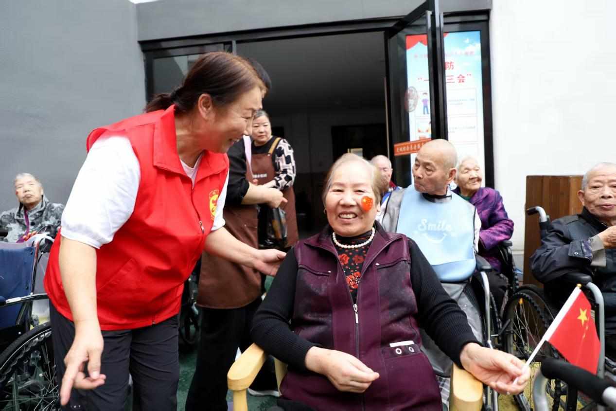 当日下午3:00,活动准时开场,第一份心意就是“陪老人们好好唠唠”。现场特意设置了“时光留影”“围坐话家常”两个小角落:节日背景墙前,志愿者举着相机忙前忙后,帮老人和家属把月饼、小国旗举在胸前,把此刻的团圆定格成照片;茶话会上,公之益志愿服务协会购买的月饼、蛋糕及多种水果摆了满桌,老人们握着志愿者的手,讲起过去的故事,话里全是岁月的暖。