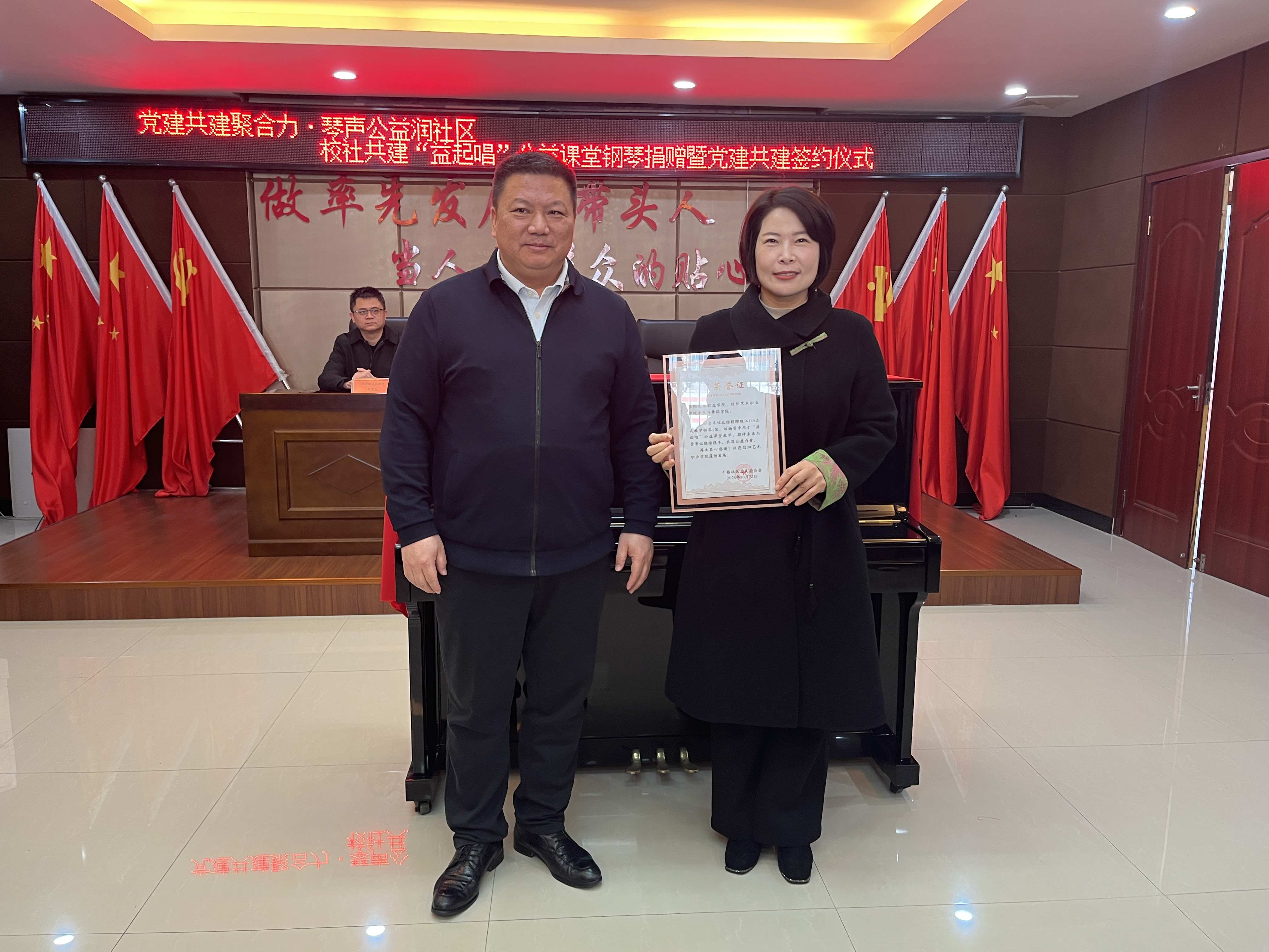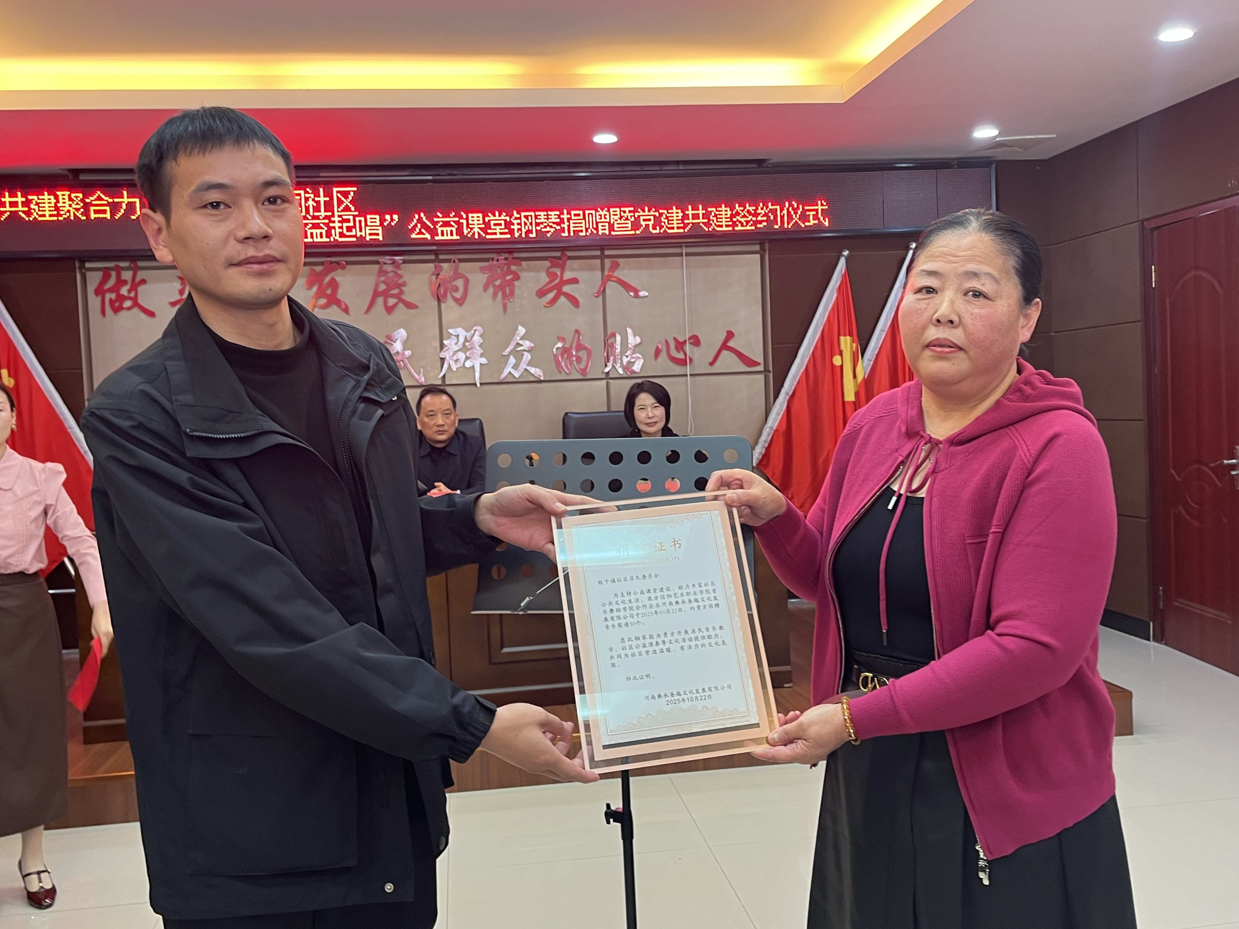 10月22日,市委组织部机关党委、信阳艺术职业学院音乐与舞蹈学院党支部及千禧社区党支部,在羊山新区千禧社区党群服务中心举行三方党建共建签约暨千禧社区“益起唱”禧音合唱团公益课堂钢琴捐赠仪式。