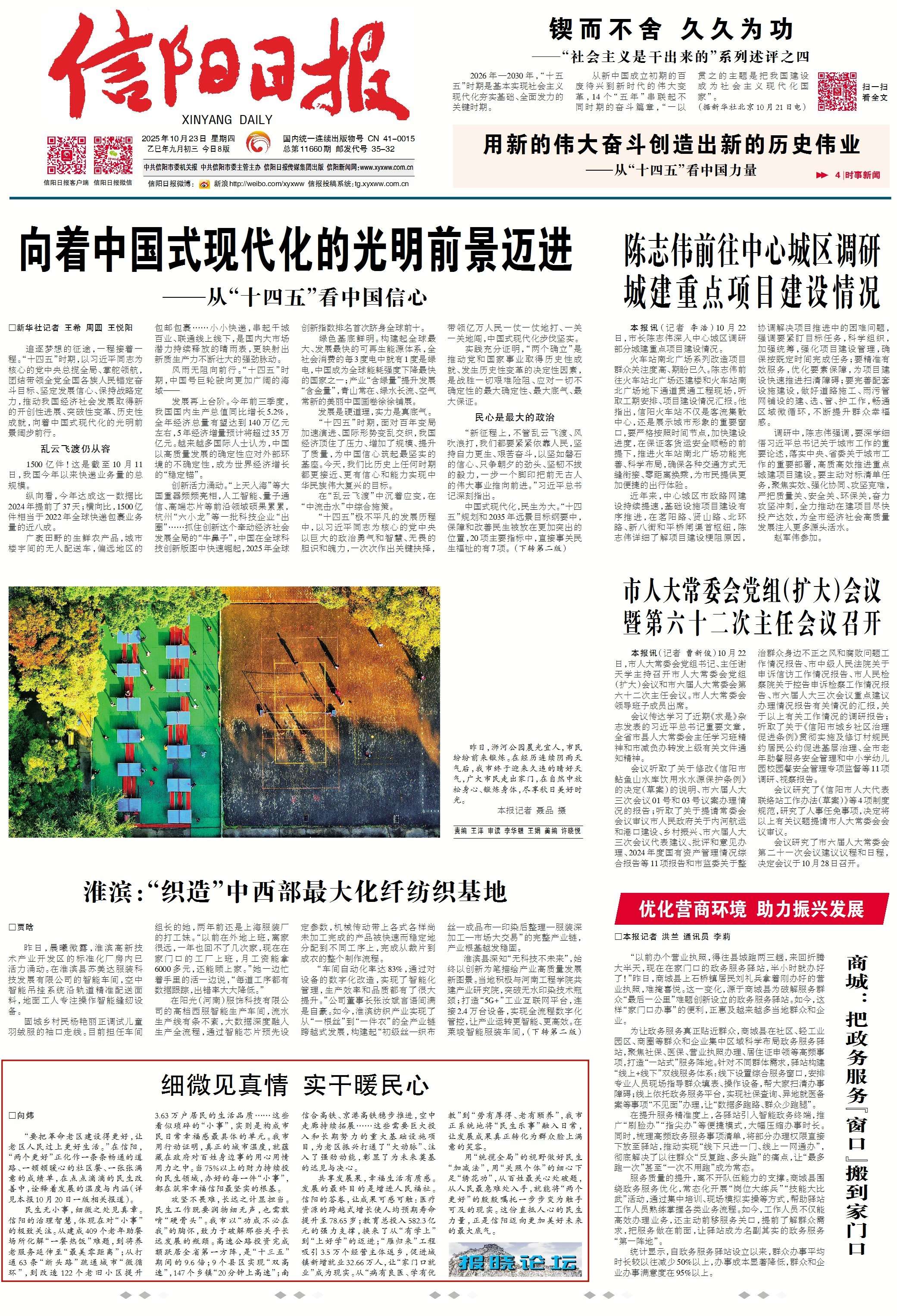 “要把革命老区建设得更好,让老区人民过上更好生活。”在信阳,“两个更好”正化作一条条畅通的道路、一顿顿暖心的社区餐、一张张满意的成绩单,在点点滴滴的民生改善中,诠释着发展的温度与内涵(详见信阳日报10月20日一版相关报道)。